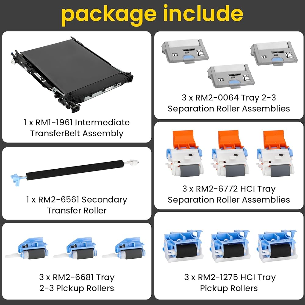 【Package Contents】P1B93A transfer belt includes 1XRM1-1961 Intermediate Transfer Belt,1 x RM2-6561 Secondary Transfer Roller,3 x RM2-6681 Tray 2-3 Pickup Rollers,3 x RM2-0064 Tray 2-3 Separation Roller Assemblies,3 x RM2-6772 HCI Tray Separation Roller Assemblies,3 x RM2-1275 HCI Tray Pickup Rollers