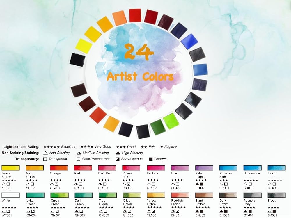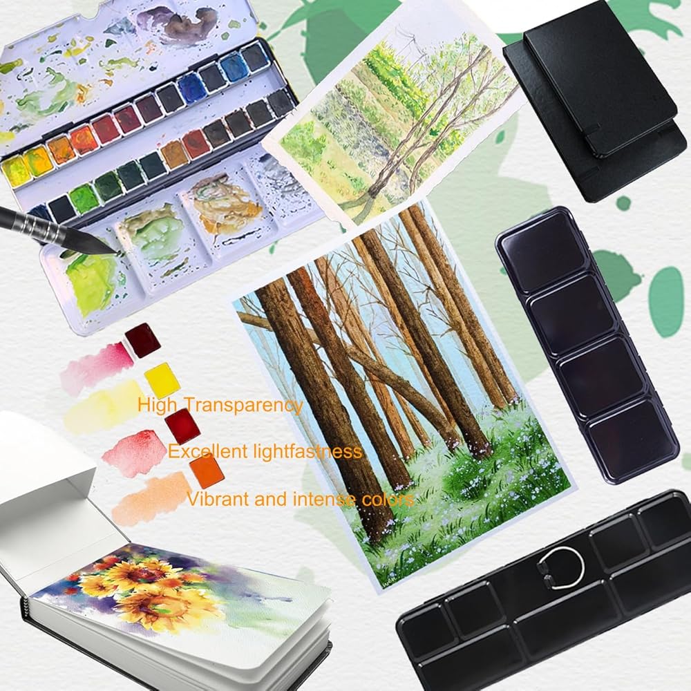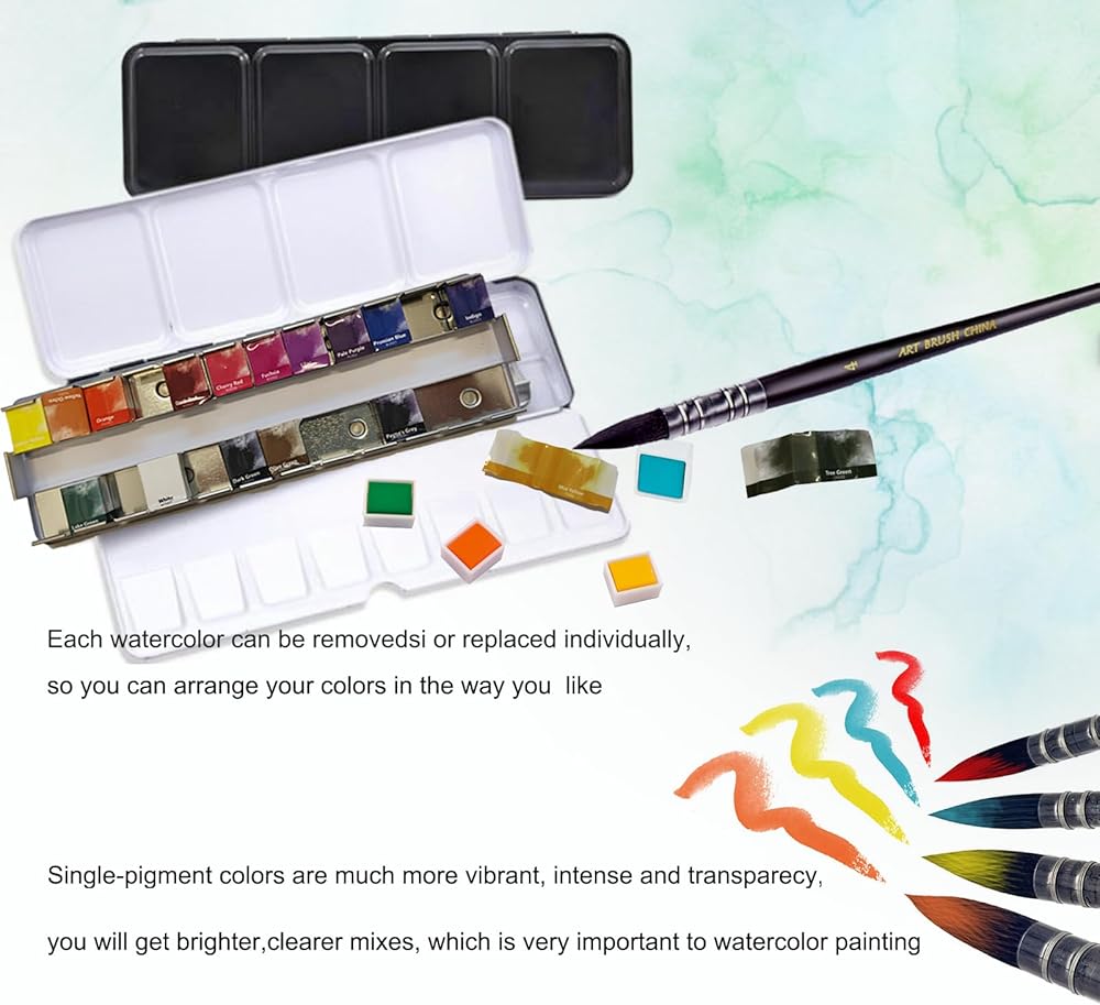 ألوان مائية بجودة الفنان - 24 لونًا نابضًا بالحياة نصف لوحة من الألوان المائية، نستخدم أصباغ عالية الجودة، وشفافية عالية، وبقع قوية، وقابلة للمزج، وتصنيف ممتاز لثبات الضوء. سريع الجفاف، خفيف سريع، ليس من السهل أن يبهت، يجعلك عملًا فنيًا أكثر بريقًا. ويحتوي صندوق القصدير المحمول على لوحة خلط داخل الغطاء، والتي يمكن غسلها بسهولة. يمكن إزالة كل وعاء من الألوان المائية أو استبداله بشكل فردي، حتى تتمكن من ترتيب الألوان حسب تفضيلاتك الخاصة وتوسيع خيارات الألوان والإمكانيات الفنية الخاصة بك.