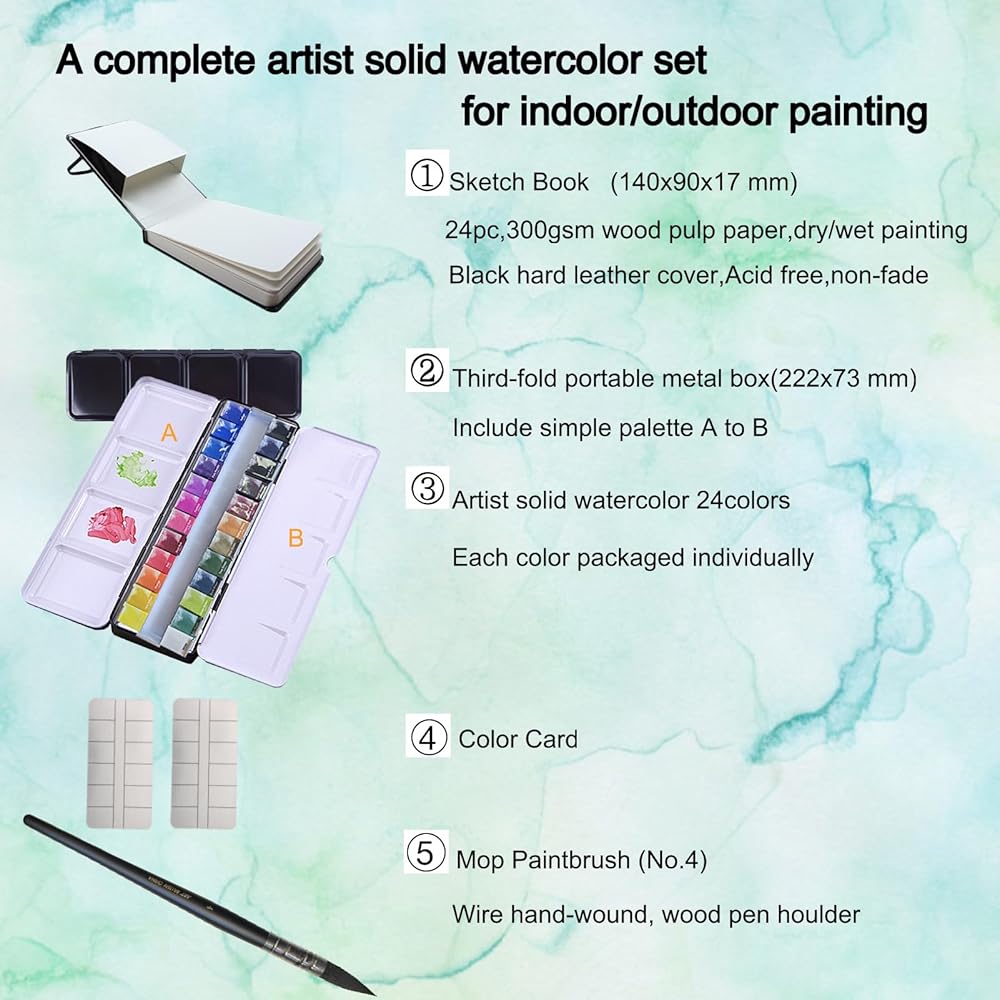 مجموعة كاملة من الألوان المائية - 24 لونًا من الألوان المائية الصلبة في صندوق معدني محمول مع لوحة ألوان، وكتاب رسم واحد (24 ورقة، 300 جرامًا للمتر المربع)، وفرشاة رسم ممسحة واحدة. كل ذلك في صندوق أسود جميل، وهو مريح جدًا لحمله أثناء التنقل للرسم في أي وقت وفي أي مكان. سواء كنت فنانًا محترفًا أو مبتدئًا، فإن مجموعة الألوان المائية هذه متعددة الاستخدامات وسهلة الاستخدام. إنها مثالية لإنشاء لوحات مائية جميلة. كما أنها هدية مثالية للعطلات مثل أعياد الميلاد والكريسماس وما إلى ذلك