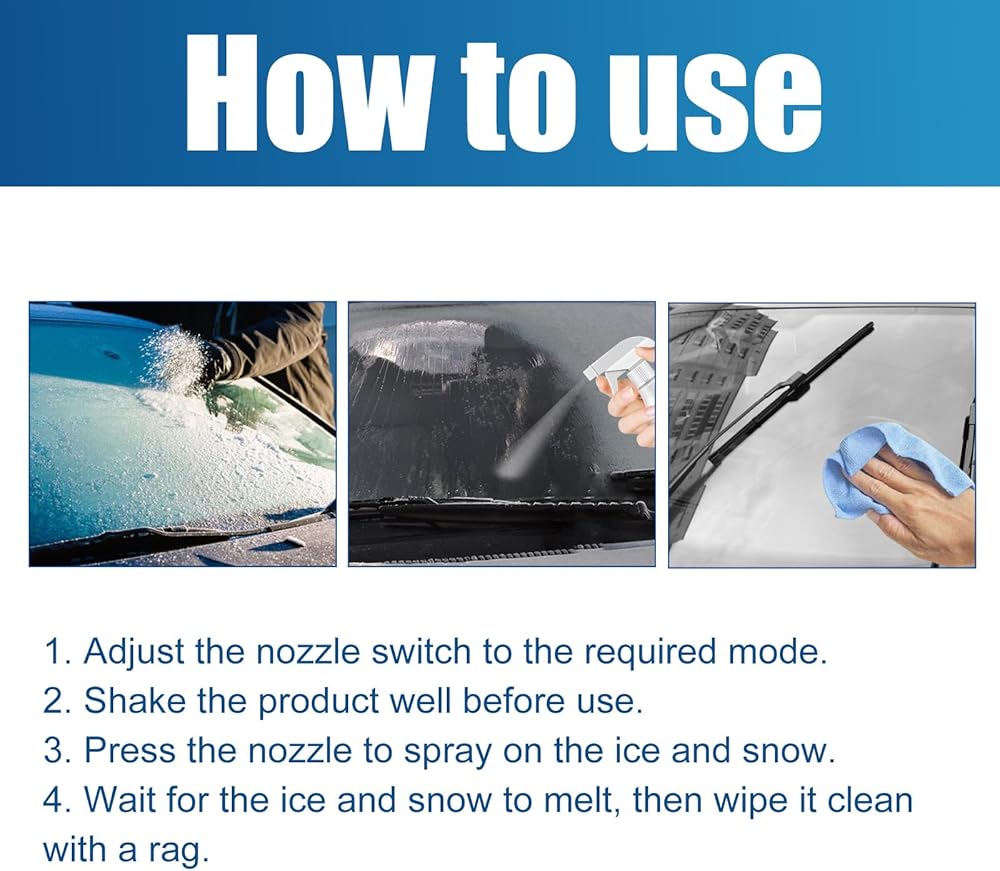 How to Use: Spray the deicing agent evenly on the glass,, then spray the deicer evenly on the frosted glass or windshield. After the ice slowly melts, wipe and clean the glass with a dry towel. Safeguard your winter driving to the best extent.