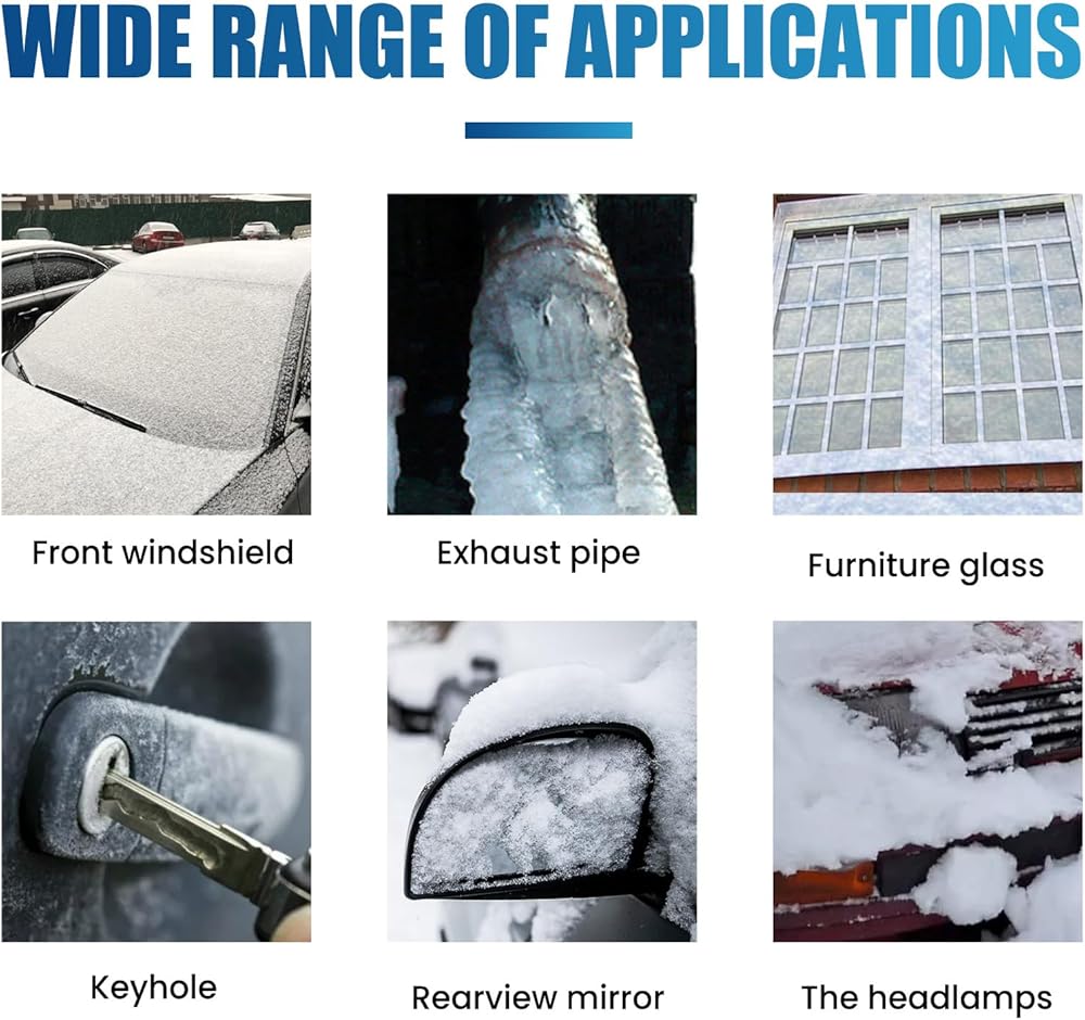 Wide Range of Applications: Our snow melting spray deicer is applicable to front windshield, exhaust pipe, furniture glass, keyhole, rearview mirror, headlight and the whole body.