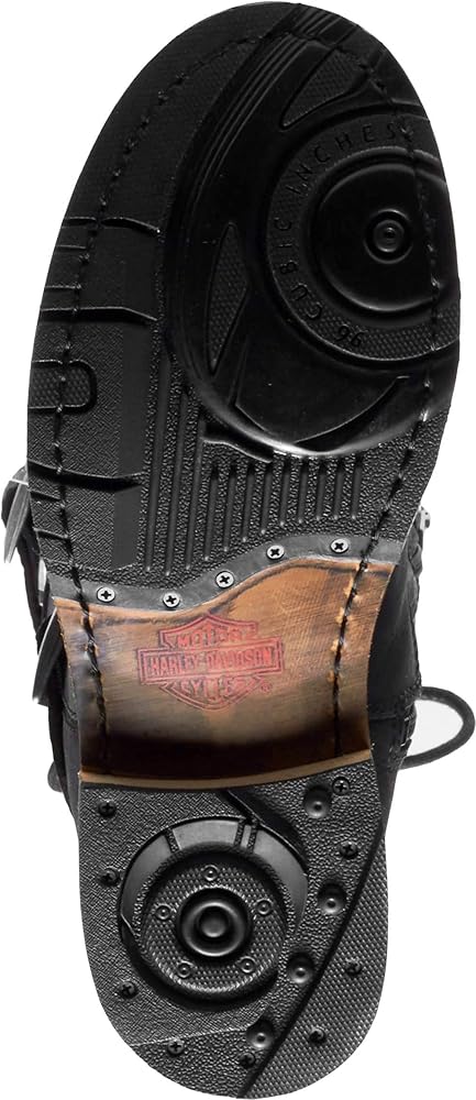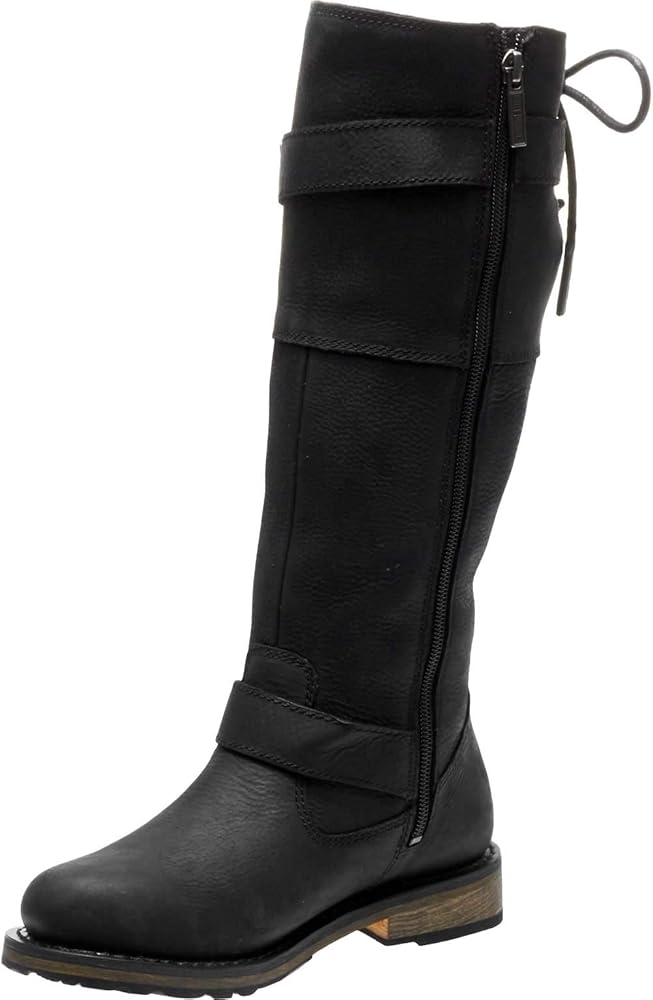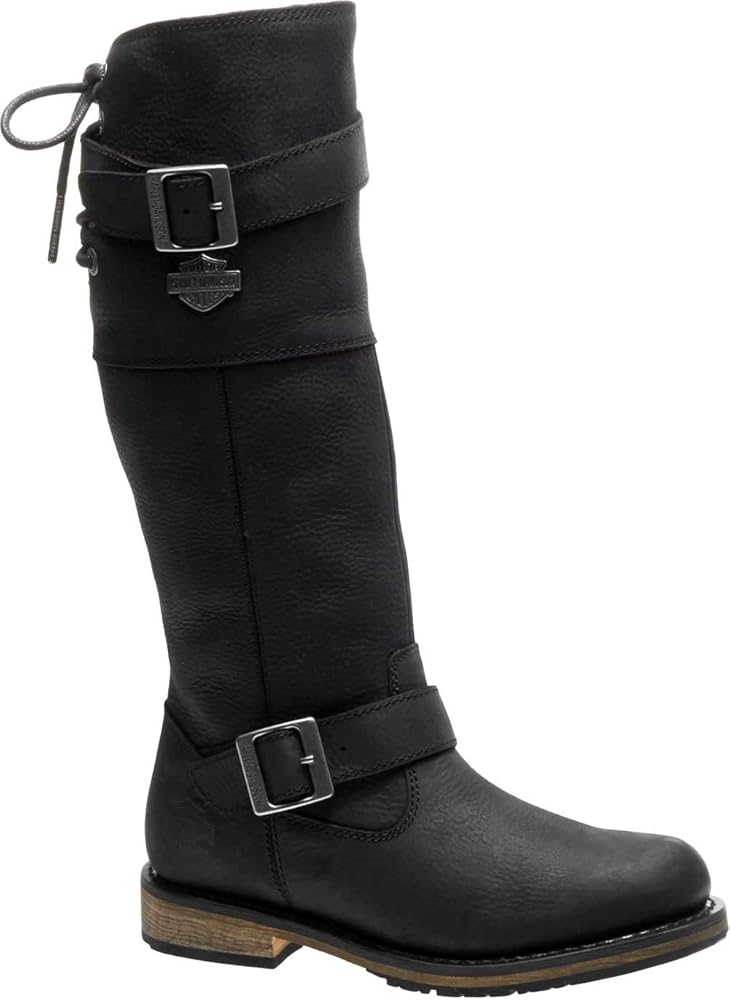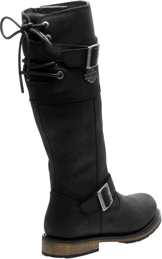 Harley-Davidson Women's Riding Appropriate* Kirtland 14-Inch Black or Brown Motorcycle Mid-Calf Boots, Black-D87155, Brown-D87156. Ride and walk tall in these solid 14-inch shaft boots. With 1.5-inch heels, the total height from street to cuff is 15.5-inches. There is no mistaking the moto appeal of these boots, both in form and function – seriously designed for the motorcycle without sacrificing fashion. Off the bike, wear with skinny or distressed pants/jeans and a loose sweatshirt or a sweater and vest. They also look great with mini-skirts. Step into these boots using the full-length YKK locking inside zippers. Once the unique adjustable back laces are tied off, snug-up the ankle strap and the shaft strap for a quick getaway. You are now set for the next outing by just stepping into the boots and zipping them up. The black boots have contrasting chrome buckles, eyelets, and a metal Bar & Shield on the shaft. The brown boots have bronze hardware that makes for a luxurious contrast. Made of full-grain leather uppers, the boots have a full-length mesh lining for hours of comfort. The soles are made with simulated leather with rubber on the street side for a comfortable and easy stride. The boot's sole, insole and upper are bound using resoleable Goodyear Welt construction processes, the most labor intensive and durable construction method available. Street side tread elements feature an off-set debossed air breather sculpted graphic with 96 CUBIC INCHES lettering. The heel has a smaller sized breather graphic without lettering. The instep has a classic Bar & Shield logo. Total height: 15.5”, Shaft height: 14", Heel height: 1.5". Sizes US: M 5-10, 11. Manufacturer Part Number, Black-D87155, Brown-D87156.*Riding Appropriate-Goodyear Welt construction, resoleable footwear ideal for riding motorcycles.