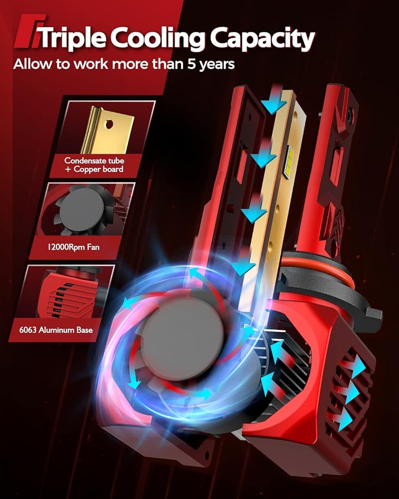 عمر ممتد لأكثر من 5 سنوات: تتميز مصابيح الضباب LED T5 H4 بأنبوب نحاسي مدمج مع ماء مكثف، ومروحة تبريد 12,000 دورة في الدقيقة وجسم ألومنيوم 6063، مما يدعم المصابيح للعمل حتى 50000 ساعة