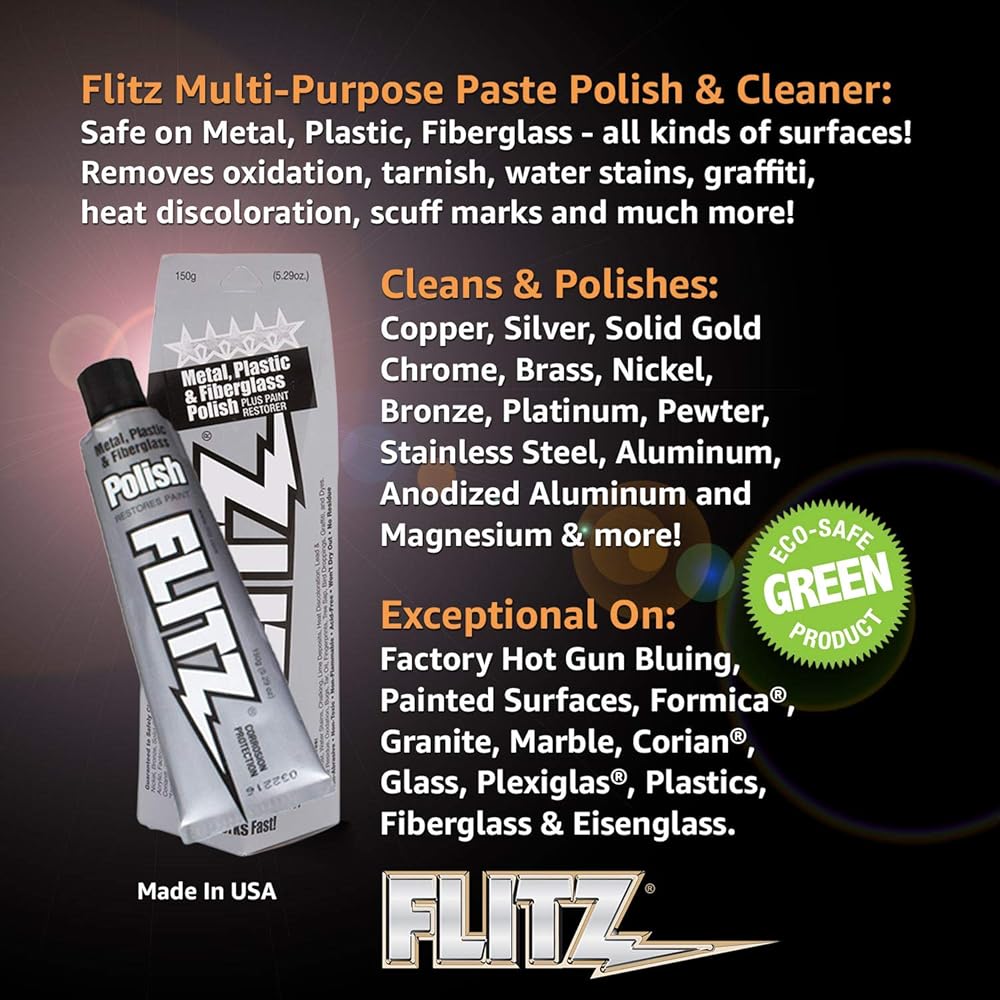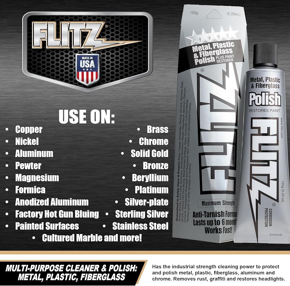 A concentrated cream that is unsurpassed in its ability to clean, polish, deoxidizes and protect. This product works faster and easier. This can be used on: brass, copper, silver plate, sterling silver, chrome, stainless steel, nickel, bronze, solid gold, aluminum, anodized aluminum, beryllium, magnesium, platinum, pewter, factory hot gun bluing, painted surfaces, formica, cultured marble, corian, glass, plexiglas, plastics, fiberglass, eisenglass, and armatel. This helps to remove tarnish, rust, water stains, chalking, lime deposits, heat discoloration, lead and powder residue, oxidation, bugs, tar, oil, fingerprints, tree sap, bird droppings, graffiti, dyes, black streaks and scuff marks. This is USDA authorized and non-toxic.