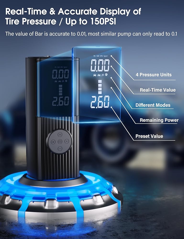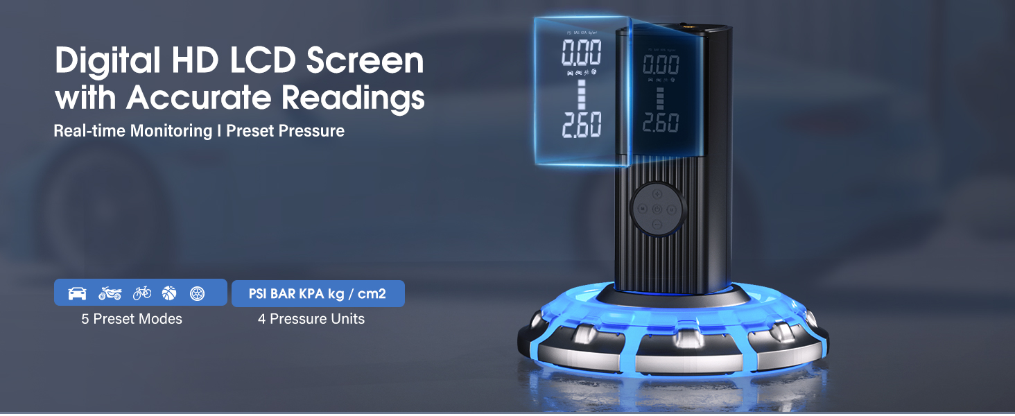 • 【قراءة دقيقة حتى 0.01】يمكن لشاشة LCD الرقمية عالية الوضوح عرض ضغط الإطارات في الوقت الحقيقي، وبيانات ضغط الإطارات المحددة مسبقًا وطاقة البطارية. يمكن أن تكون القراءة دقيقة إلى 0.1 في وحدات PSI وإلى 0.01 في وحدات Bar (معظم مضخات الهواء هذه يمكنها قراءة 0.05 فقط)، لذلك لا داعي للقلق بشأن القراءات غير الدقيقة.