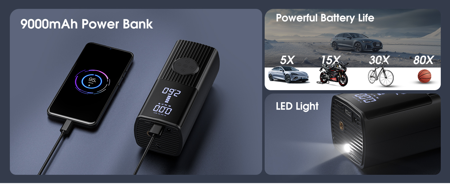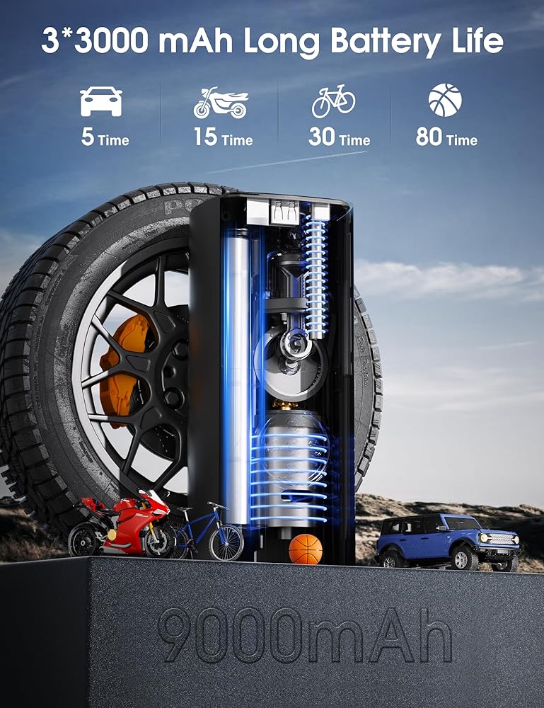 • 【ضاغط هواء لاسلكي بقدرة 9000 مللي أمبير في الساعة】بطارية مدمجة ذات سعة كبيرة قابلة لإعادة الشحن بقدرة 9000 مللي أمبير في الساعة، لا يتطلب منفاخ إطارات السيارة لنفخ الإطارات مصدر طاقة خارجي عند العمل، ويمكنه نفخ ما يصل إلى 3 إطارات شائعة الاستخدام (0-36 رطل لكل بوصة مربعة). إذا قمت بنفخ الإطارات بشكل طبيعي (مثل 25-36 رطل لكل بوصة مربعة)، فيمكن أن تعمل لمدة تصل إلى ساعتين.
