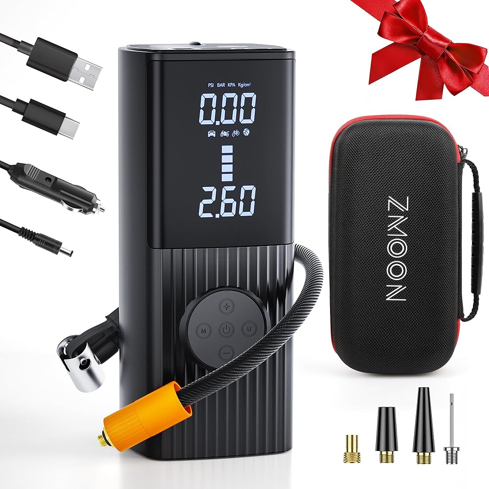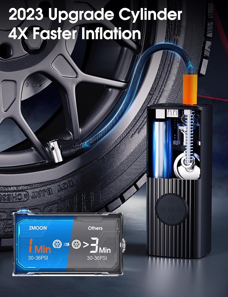 منفاخ إطارات ZMOON ضاغط هواء محمول، 2 في 1 150 رطل لكل بوصة مربعة لاسلكي ومضخة هواء تيار مستمر 12 فولت لإطارات السيارات، 9000 مللي أمبير في الساعة 4 مرات تضخم أسرع مضخة هواء لقياس الضغط المباشر للسيارة/الدراجة النارية/الدراجة/الكرة