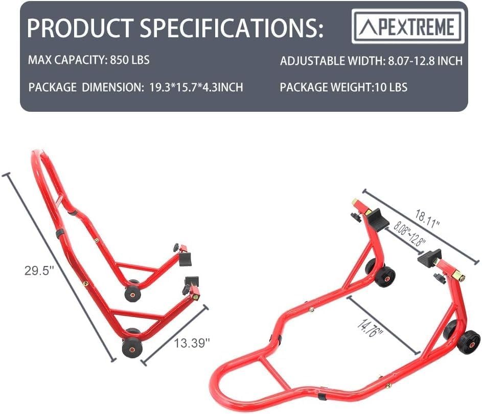 Apexreme motorcycle lift which can be used in both front and rear, is made from high-quality steel construction for easy to store, strong to use and long time to service. It can lift most motorcycles (within the adjustable width).