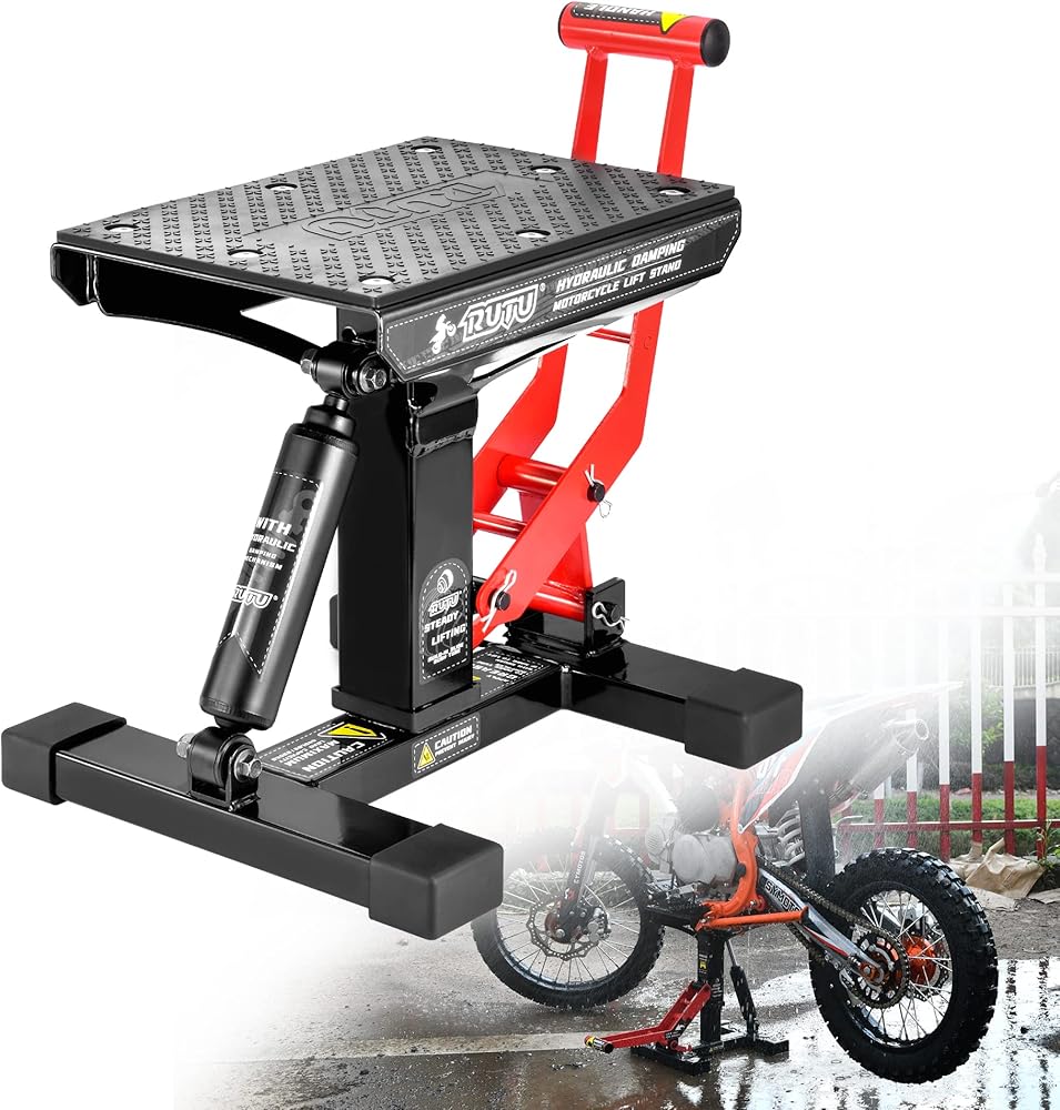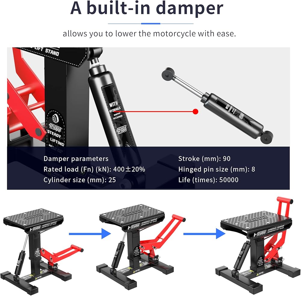 هيكل قوي، تصميم عملي - يتميز حامل جاك الدراجة النارية هذا بإطار فولاذي ملحوم معزز لمزيد من القوة والثبات. تعمل المضخة الهيدروليكية بسلاسة، كما أن المخمد المدمج يجعل خفض دراجتك أكثر أمانًا وسهولة. تعمل جلبة التثبيت المصنوعة من النايلون على تقليل الفجوة بين الإطار الفولاذي، مما يمنع التذبذب بعد رفع دراجتك النارية.