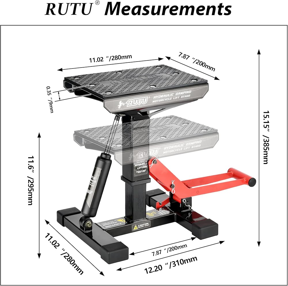 سطح النتريل المضاد للانزلاق وسعة الوزن - يحتوي حامل الدراجة النارية على وسادة مطاطية متينة وسطح عمل مقاوم للخدش يحمي الدراجات من الانزلاق والخدوش التي تسبب الصدأ، ويبلغ قياس المنصة غير القابلة للانزلاق 11 1/32 × 7 7/8 بوصة . (280 × 200 مم)، 8 مسامير رأس مستديرة تربط الوسادة المطاطية بإحكام. تبلغ سعتها القصوى للحمل 1000 رطل (450 كجم). وهذا يجعلها أيضًا مناسبة لمركبات ATV وUTVs وعربات الثلوج.