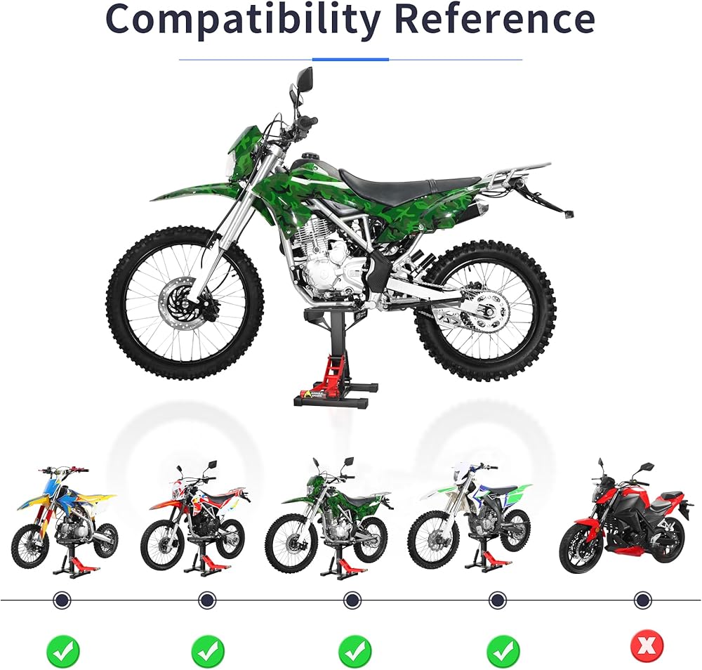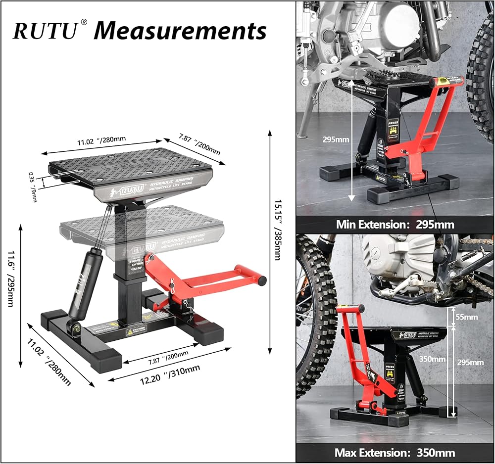 معدات المرآب متعددة الاستخدامات - يحتوي مصعد الدراجة النارية هذا على مستويين للارتفاع: الحد الأدنى لارتفاع المنصة 11.6 بوصة (295 ملم) / الحد الأقصى (المرتفع) لارتفاع المنصة 15.15 بوصة (385 ملم). مثالية للدراجات النارية ذات 11.81 بوصة - 13.78 بوصة (300 مم - 350 مم) الإطار السفلي / المحرك - الخلوص الأرضي. يرجى قياس الحد الأدنى من الخلوص الأرضي لدراجتك النارية قبل الشراء، لتجنب أن يكون الحد الأدنى لارتفاع الحامل مرتفعًا جدًا وغير قادر على الاستخدام.