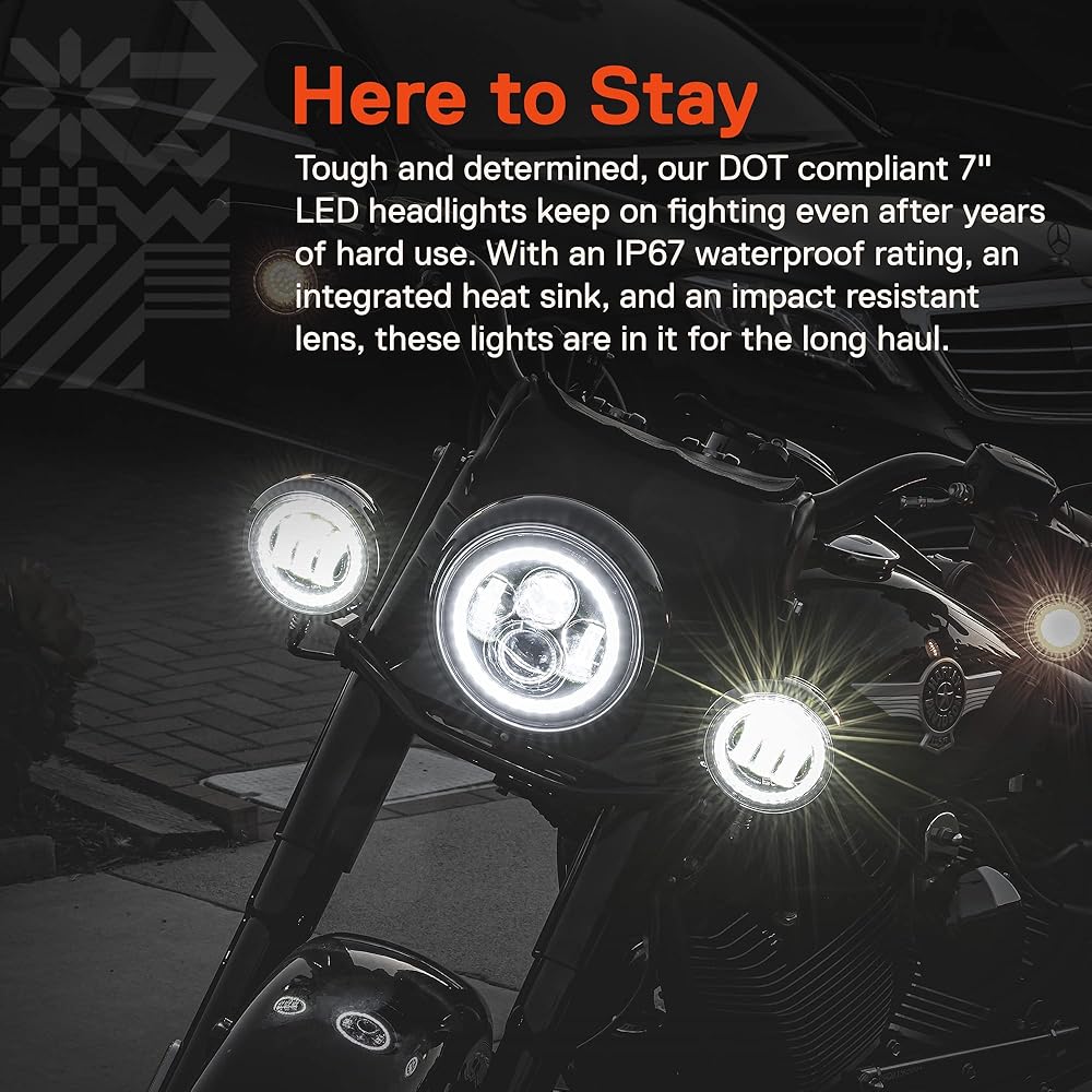 • هنا لتبقى - قوية وحازمة، مصابيح LED الأمامية مقاس 7 بوصات المتوافقة مع DOT تستمر في القتال حتى بعد سنوات من الاستخدام الشاق. مع تصنيف IP67 المقاوم للماء، ومغسلة حرارية مدمجة، وعدسة مقاومة للصدمات، تظل هذه المصابيح موجودة لفترة طويلة سحب.