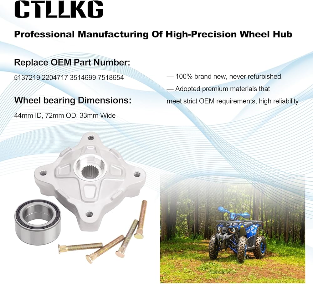 Package included: 1 x front Wheel Hub,1 x Double Row Wheel Bearing,4 x Wheel Stud. Wheel bearing Dimensions: 44mm ID, 72mm OD, 33mm Wide. NOTE:Fit Front Wheel Only! DO Not Fit Rear Wheel
