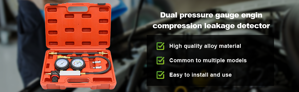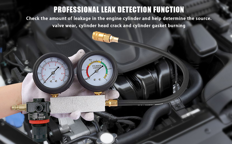[سهل الاستخدام] - قم بتثبيت الخرطوم على الأسطوانة، والوحدة بمصدر الهواء، ومعايرة مقياس التسرب، وتوصيل الوحدة بخرطوم الأسطوانة. يتم التشخيص من خلال ملاحظة كمية التسرب المشار إليها على مقياس تسرب الأسطوانة والاستماع إلى التسرب في نقاط مختلفة من نظام السيارة. مصمم لاكتشاف مجموعة متنوعة من أخطاء المحرك الشائعة. بما في ذلك: حلقات المكبس البالية، والصمامات البالية، والشقوق في جدران الأسطوانات وحشيات الرأس المنفوخة.