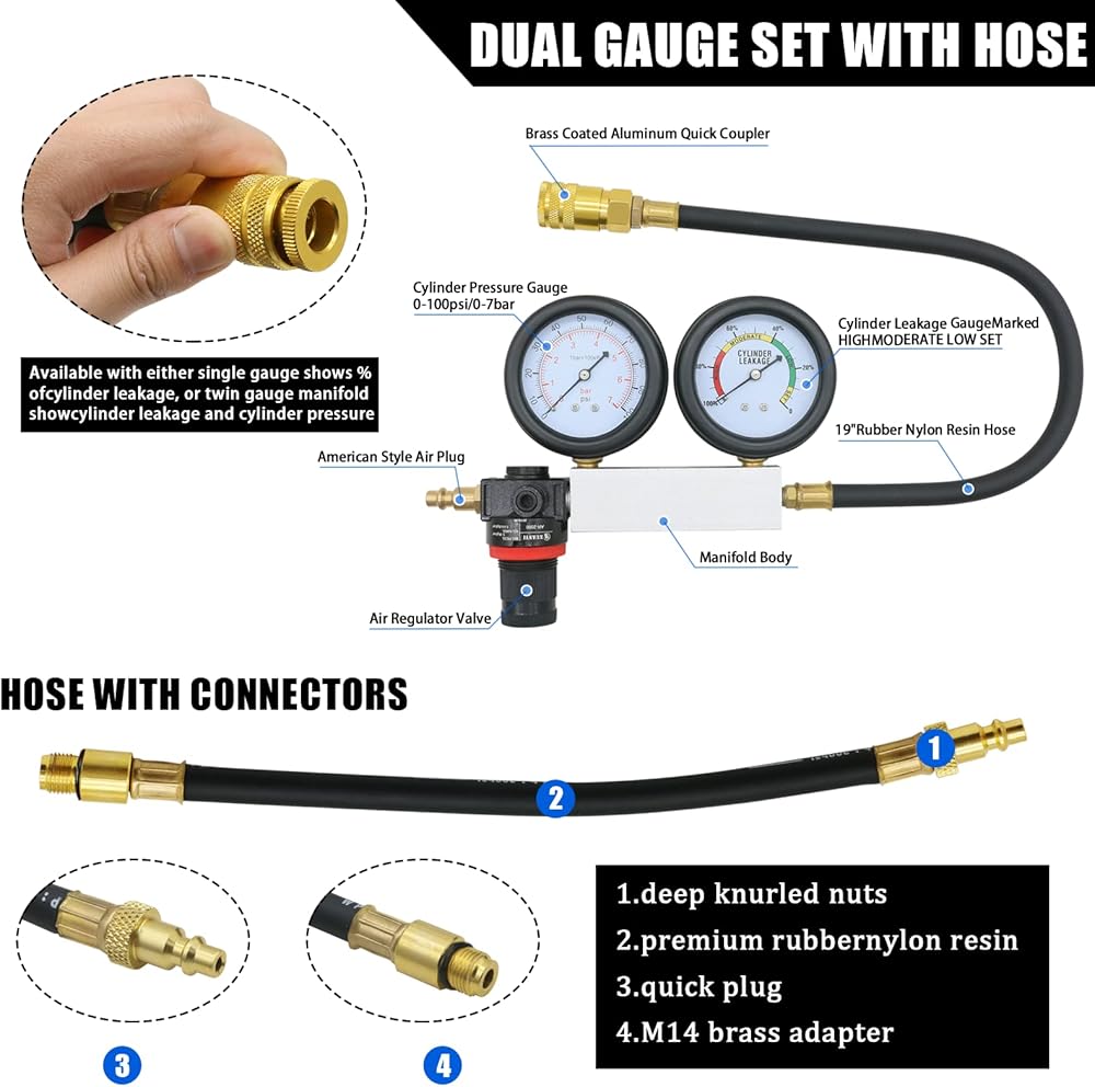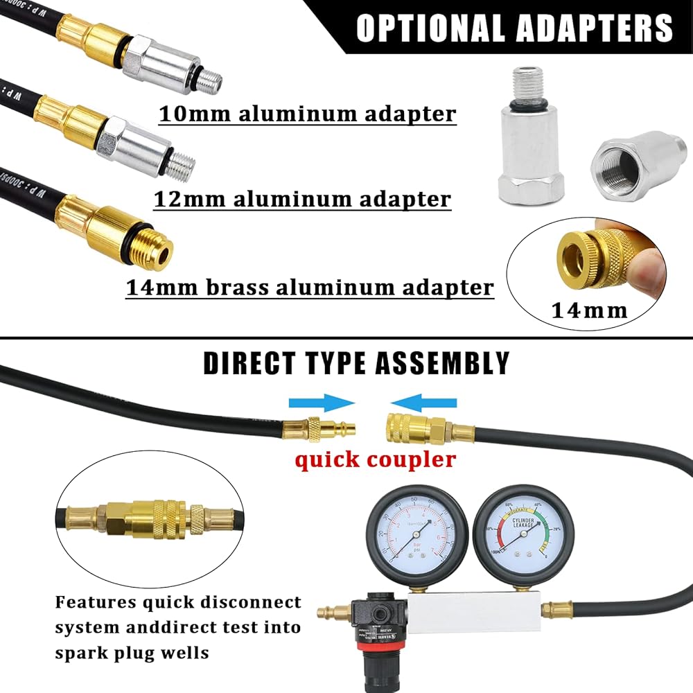 [يناسب سيارتك] - مناسب للاستخدام على أي محركات بنزين رباعية الأشواط مع شمعات إشعال 10 أو 12 أو 14 مم. يقوم جهاز الاختبار بفحص كمية التسرب في أسطوانة المحرك ويساعد في تحديد المصدر. مثالية لاختبار الشاحنات والسيارات ذات الطراز المتأخر حيث يكون التخليص في حده الأدنى.