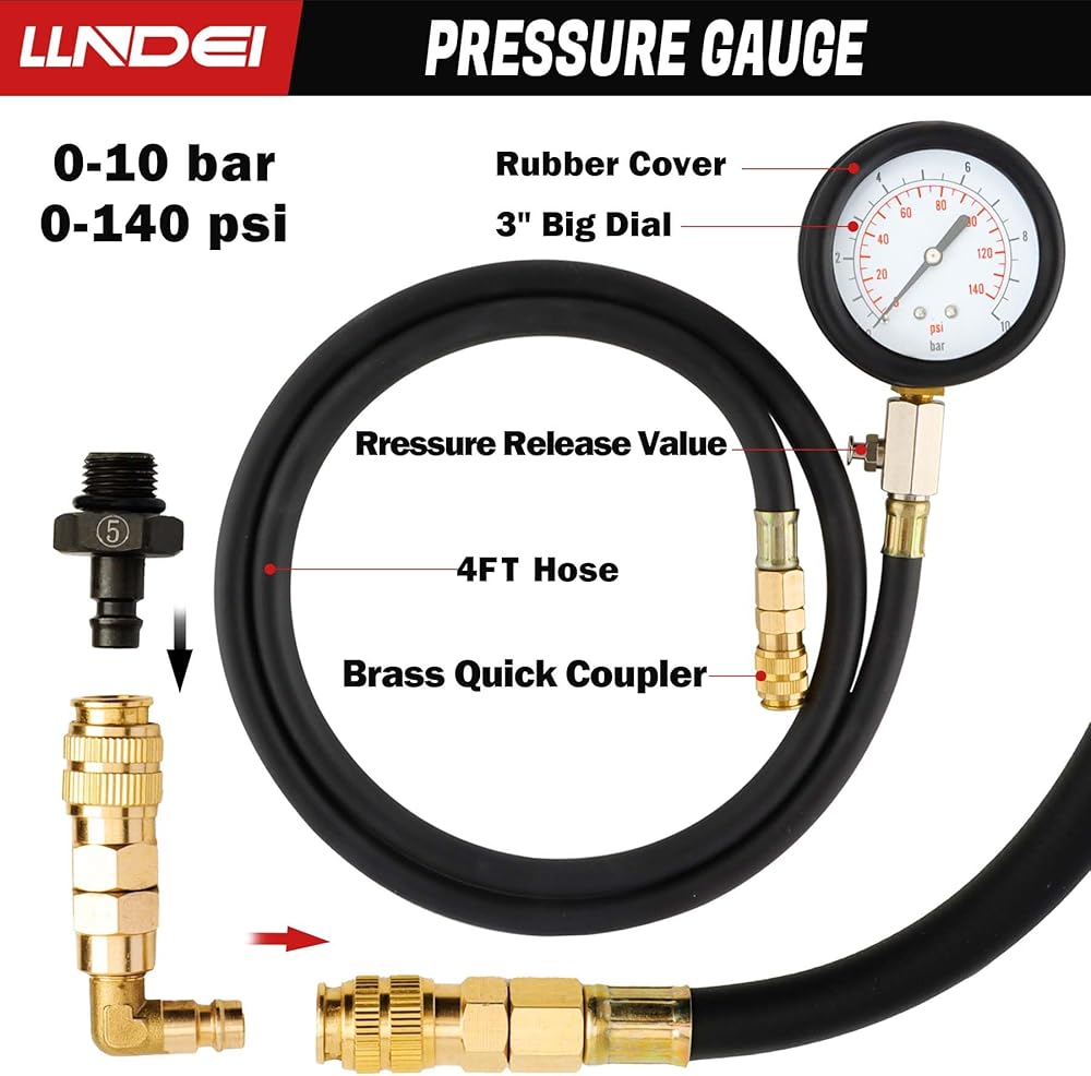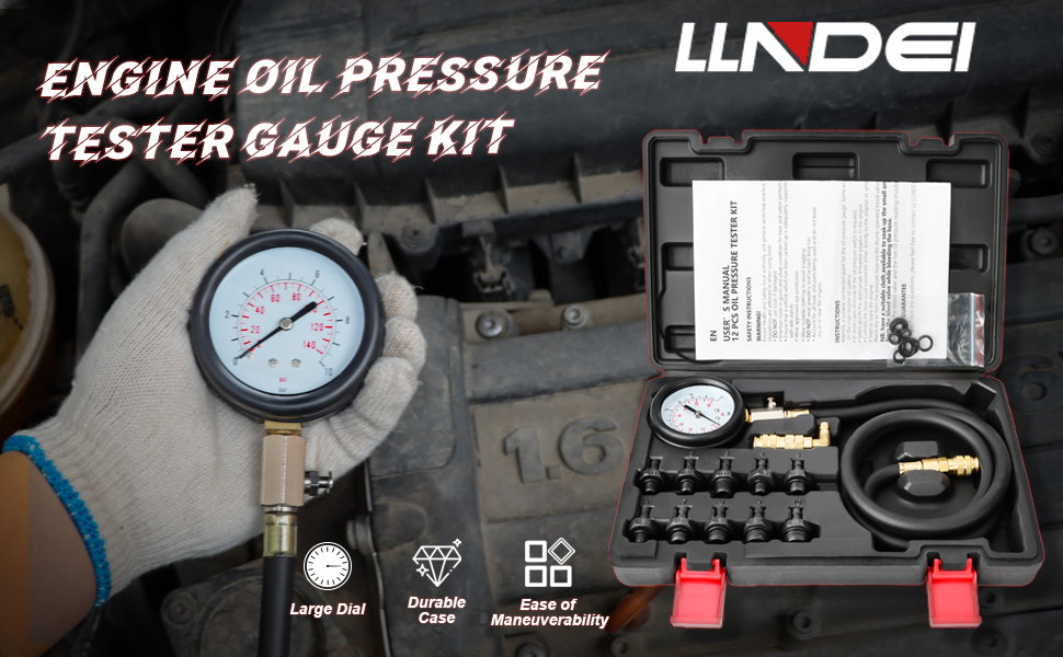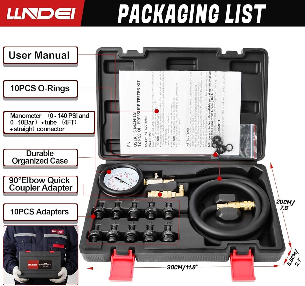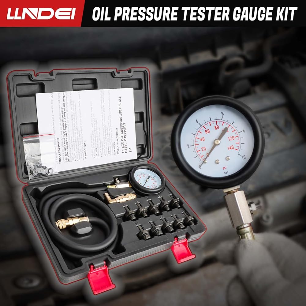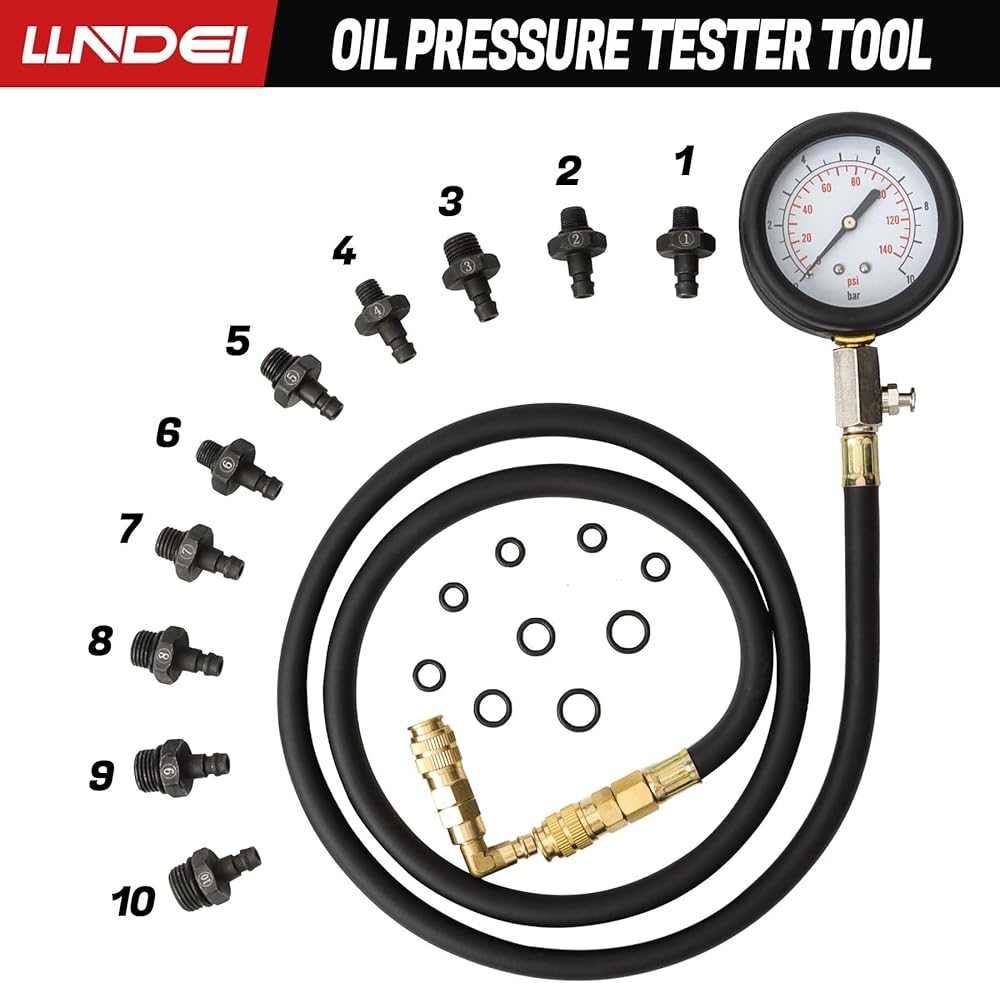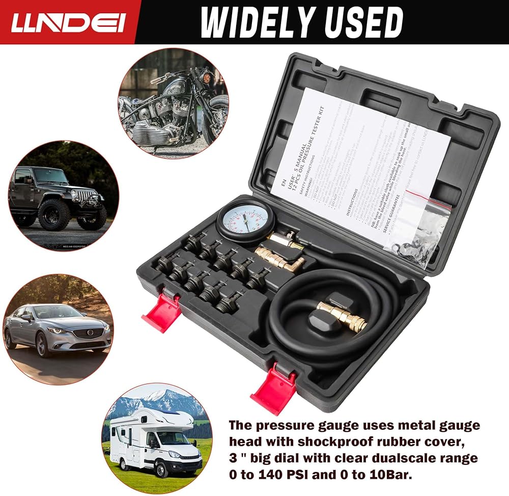 أداة اختبار ضغط الزيت من LLNDEI، مجموعة قياس ضغط زيت المحرك 0-140 رطل لكل بوصة مربعة، اختبار تشخيص ناقل الحركة الأوتوماتيكي للسيارات والشاحنات ATV (أسود)
