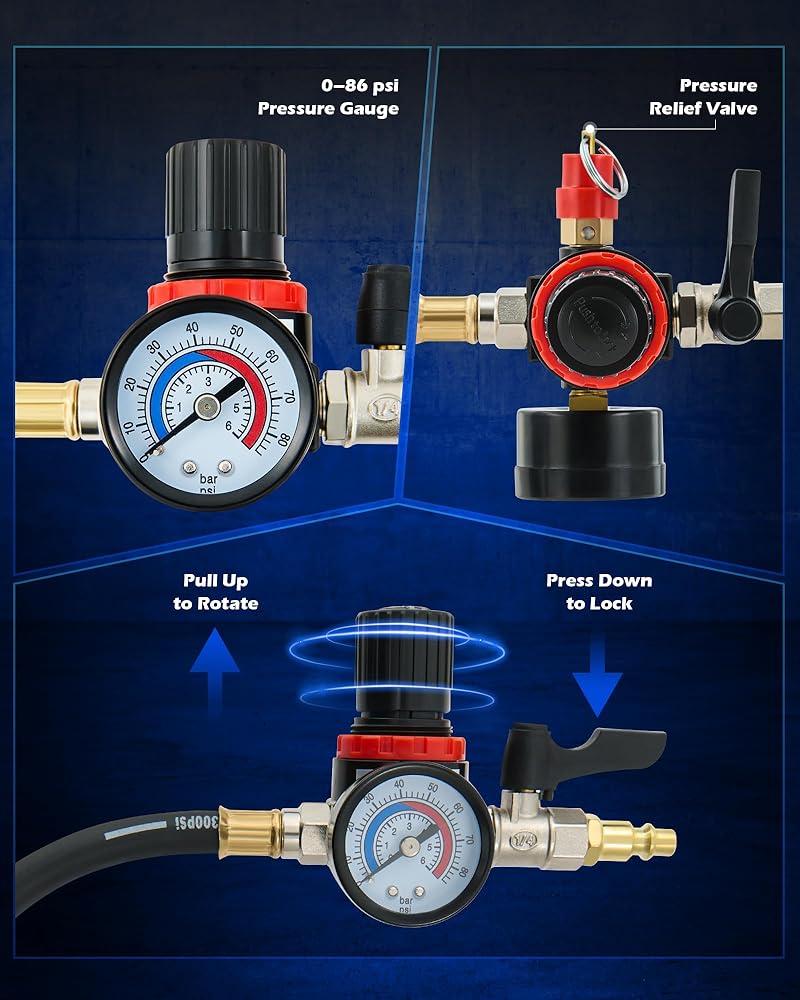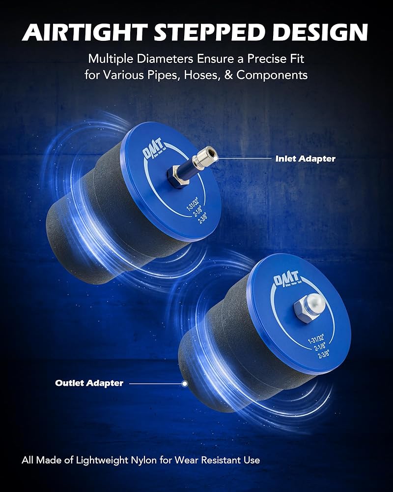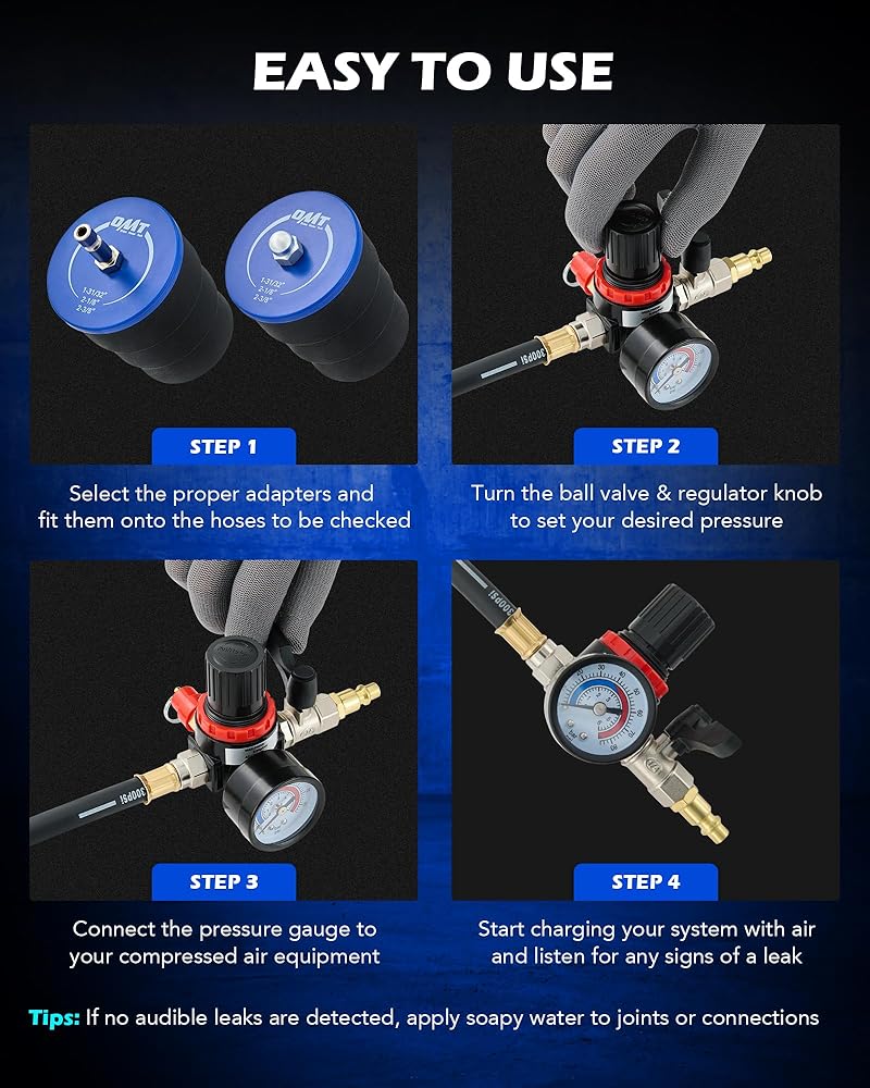عملية سهلة: ما عليك سوى توصيل المحولات، وتوصيل مقياس الضغط بخط طيران ورشة العمل الخاصة بك، والضغط على النظام، والاستماع إلى أي مؤشرات على وجود تسرب.