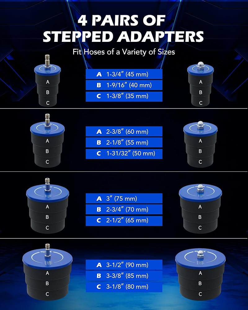 4 أزواج من المحولات المتدرجة: كل محول، يتميز بـ 3 خطوات مصممة بعناية، يضمن ملاءمة آمنة للخراطيم ذات الأحجام المختلفة. القطر الخارجي لكل زوج هو كما يلي: 1-3/8"، 1-9/16"، 1-3/4"، 1-31/32"، 2-1/8"، 2-3/8" ; 2-1/2 بوصة، 2-3/4 بوصة، 3 بوصة، و3-1/8 بوصة، 3-3/8 بوصة، 3-1/2 بوصة، مما يوفر تغطية شاملة.