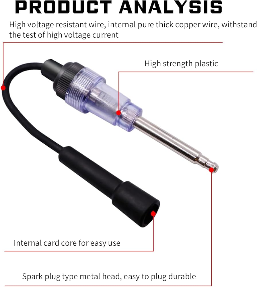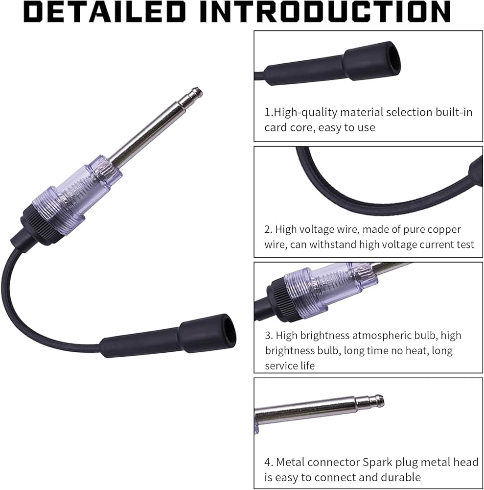 • Simple Installation: Connect the black connector to the spark plug and insert the metal end of the tester into the spark plug wire. The automotive inline spark plug tester is a practical diagnostic tool for checking engine faults. The automotive inline spark plug tester is long enough to detect wiring in tight areas.