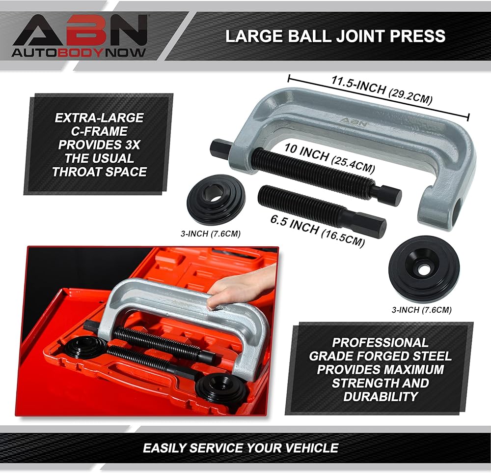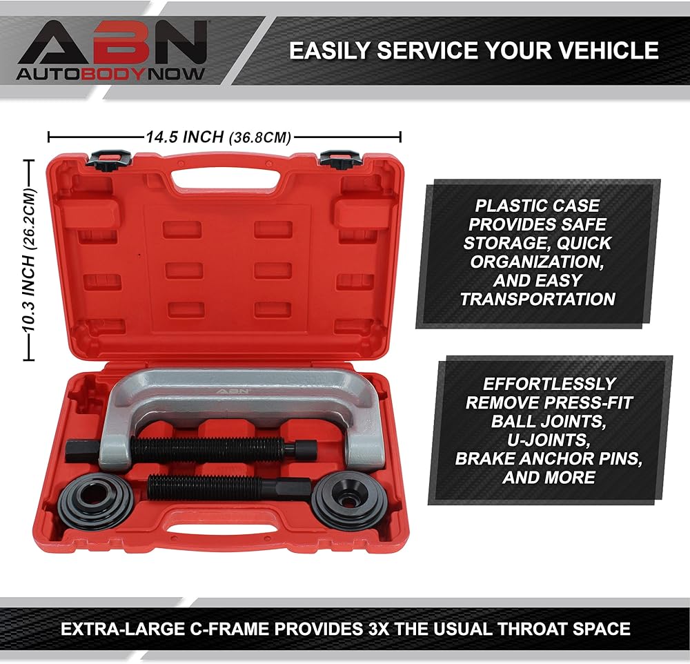 [خدمة سيارتك بسهولة]: حافظ على نظام التعليق الخاص بك يعمل بسلاسة عن طريق استبدال المفاصل الكروية البالية أو الصدئة بمجموعة أدوات إزالة المفاصل الكروية من ABN؛ تستخدم كمجموعة سحب لمفاصل الكرة، أو أدوات جلبة ذراع التحكم، أو مجموعة ضغط المفاصل على شكل حرف U، أو مجموعة ضغط قضيب الربط ودبوس المسار