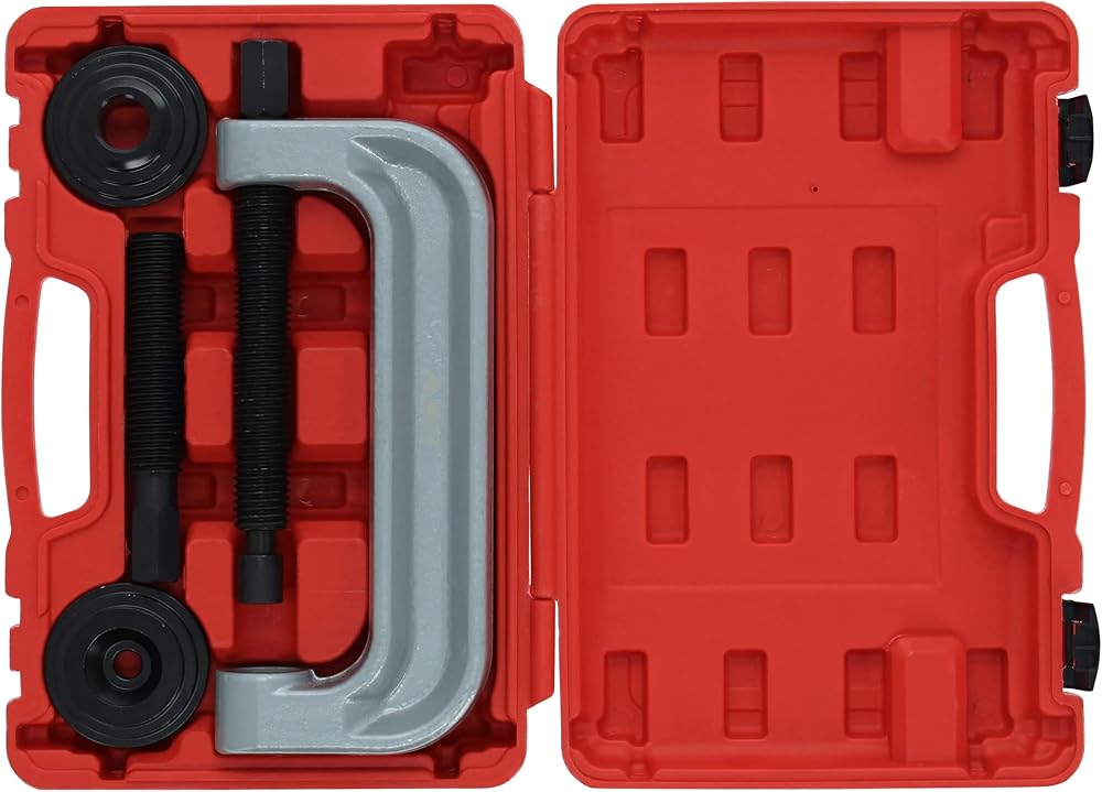 [المحتويات]: أداة ضغط مفصل كروي كبيرة جدًا بطول 11.5 بوصة (29.2 سم) على شكل حرف C تحتوي على 2 براغي ضغط قابلة للتبديل ومحول رأس برغي ضغط 3.5 بوصة (8.9 سم)؛ محولا ضغط سيارات متدرجان بعرض 3 بوصات (7.6 سم) يناسبان براغي الضغط مقاس 10 و6.5 بوصات (25.4 و16.5 سم)