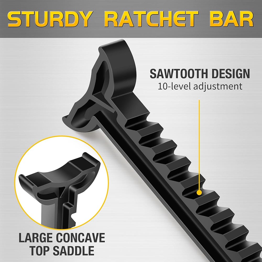 [قضيب سقاطة قوي]: مصنوع من حديد مطاوع عالي الجودة، يتميز قضيب السقاطة متعدد المواضع بتصميم سن المنشار، مما يسمح بتعديل الارتفاع السريع الذي يتم تثبيته في مكانه. سرجها العلوي المقعر الكبير يدعم الحمولة بقوة للحفاظ على السلامة