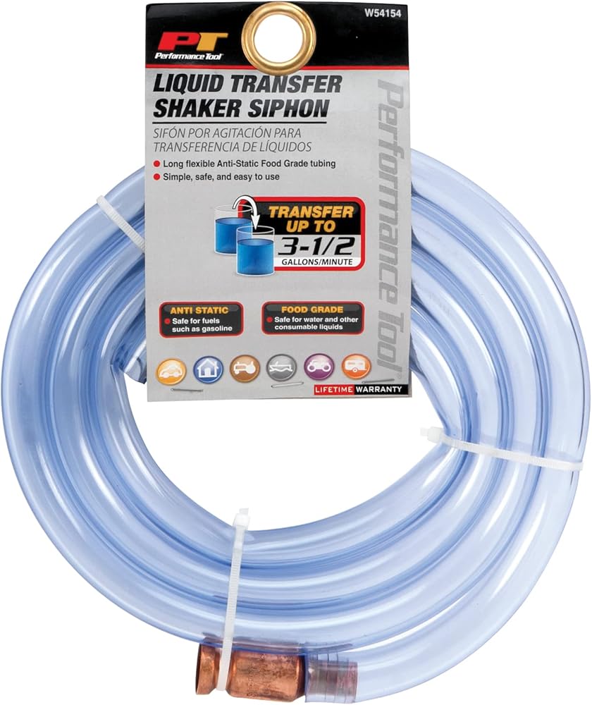 DescriptionThe Performance Tool W54154 Food-Grade Liquid Transfer Shaker Siphon Tube Hose is the perfect tool for efficient transfer of fluids from one container to another. With the ability to move up to 3.5 gallons of liquid per minute, this shaker siphon tube hose is ideal for a variety of applications, including home, farm, fleet, auto, marine, and more. Made from food-grade materials, this siphon tube hose is safe to use with a variety of fluids, including fuels, gasoline, diesel, water, and more. The W54154 features a simple design that is easy to use - simply shake the hose up and down to start the transfer process. Plus, the 6-foot anti-static tube ensures safe and efficient transfer of fluids, reducing the risk of sparks and static discharge during use. Get the Performance Tool W54154 Food-Grade Liquid Transfer Shaker Siphon Tube Hose and make fluid transfer easy and efficient!