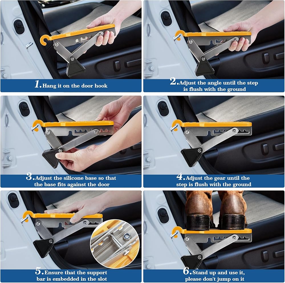 7 Adjustable Height Levels: EKEPIN car door step like a mini ladder with 7 adjustable height gears to accommodate more types of doors. You can use it to access the car roof easily and makes loading and unloaded your roof rack faster. It can reduced the number of tools required for travel