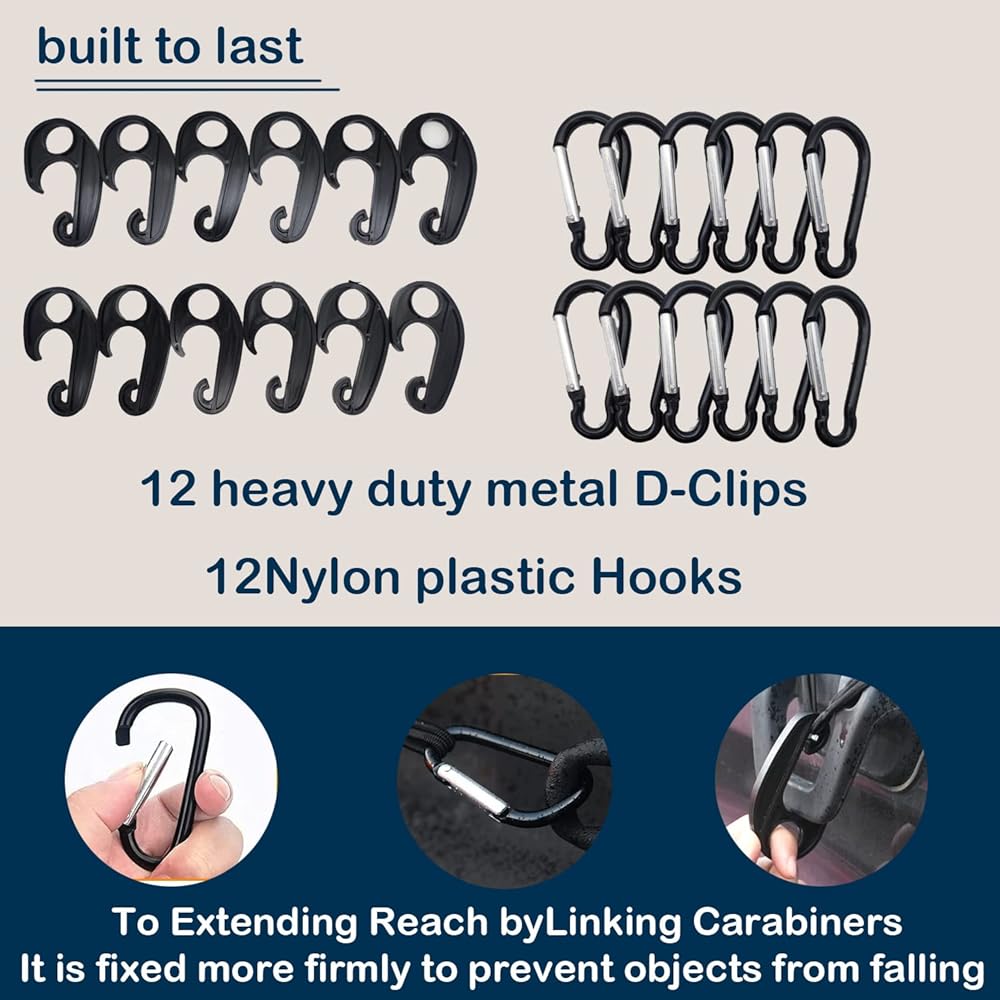 [Heavy hook x12 and universal hook x12] -12 heavy duty durable 8mm diameter aluminum D-clip mountaineering buckles, 12 ABS universal hooks, a total of 24 hooks. There are 24 hooks in both styles, which can solve the fixing problem in any case.