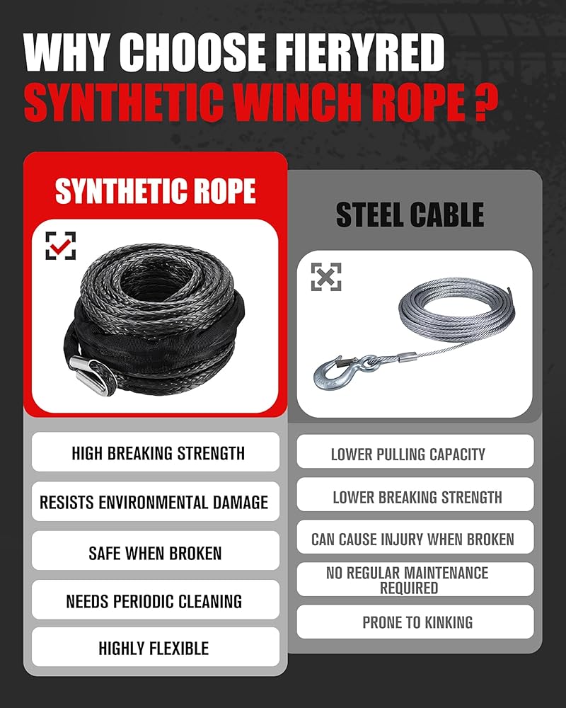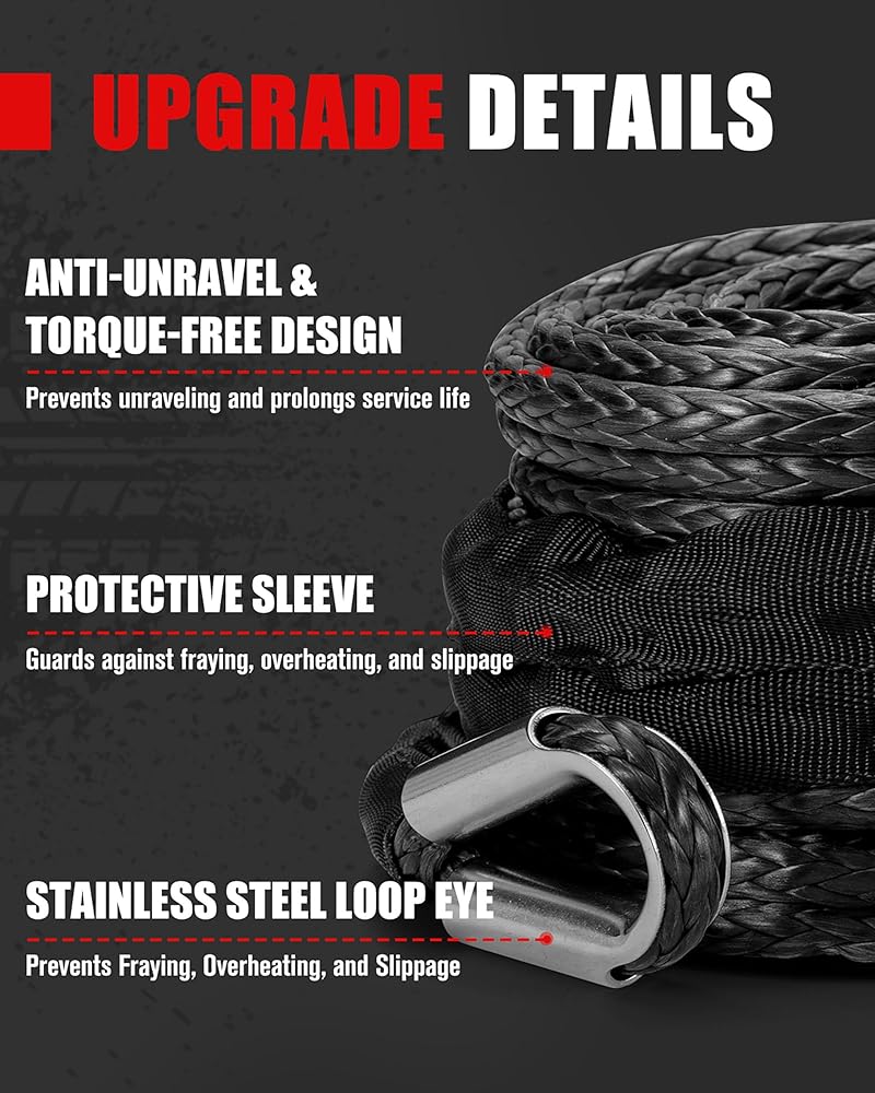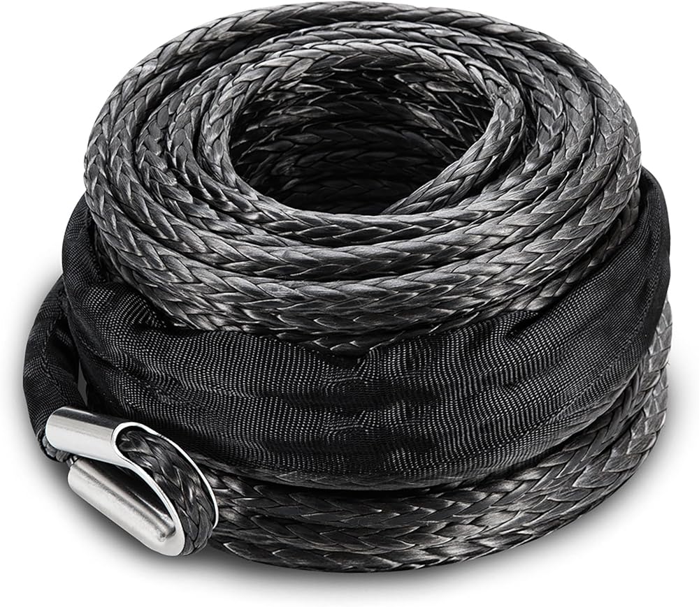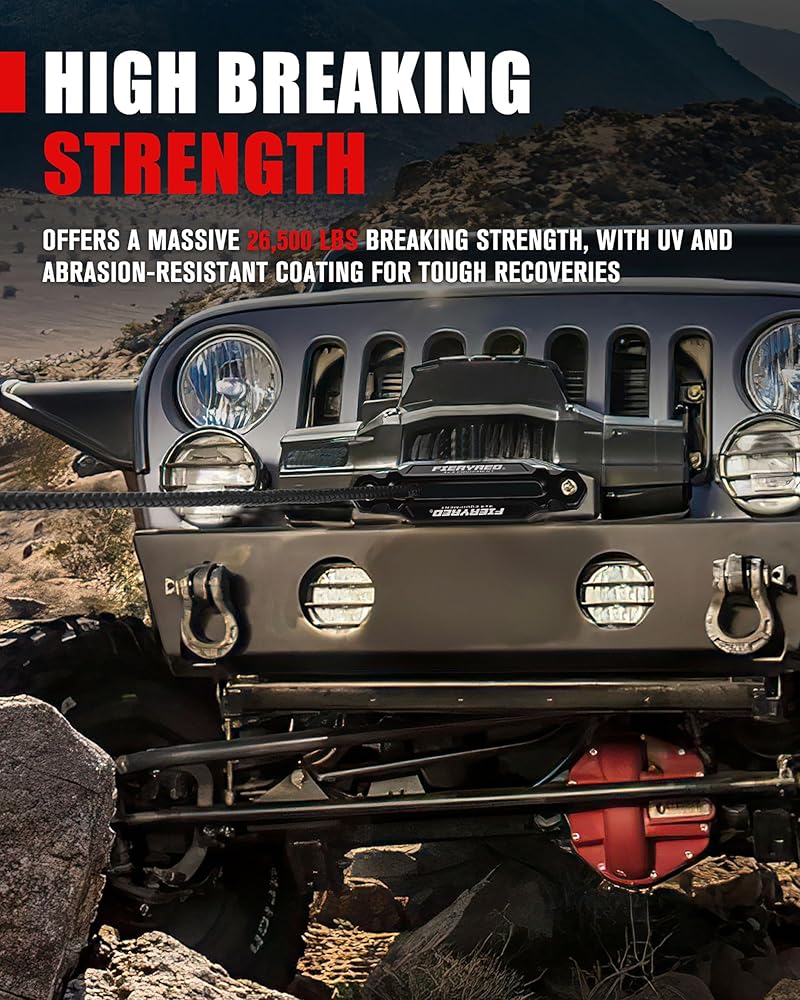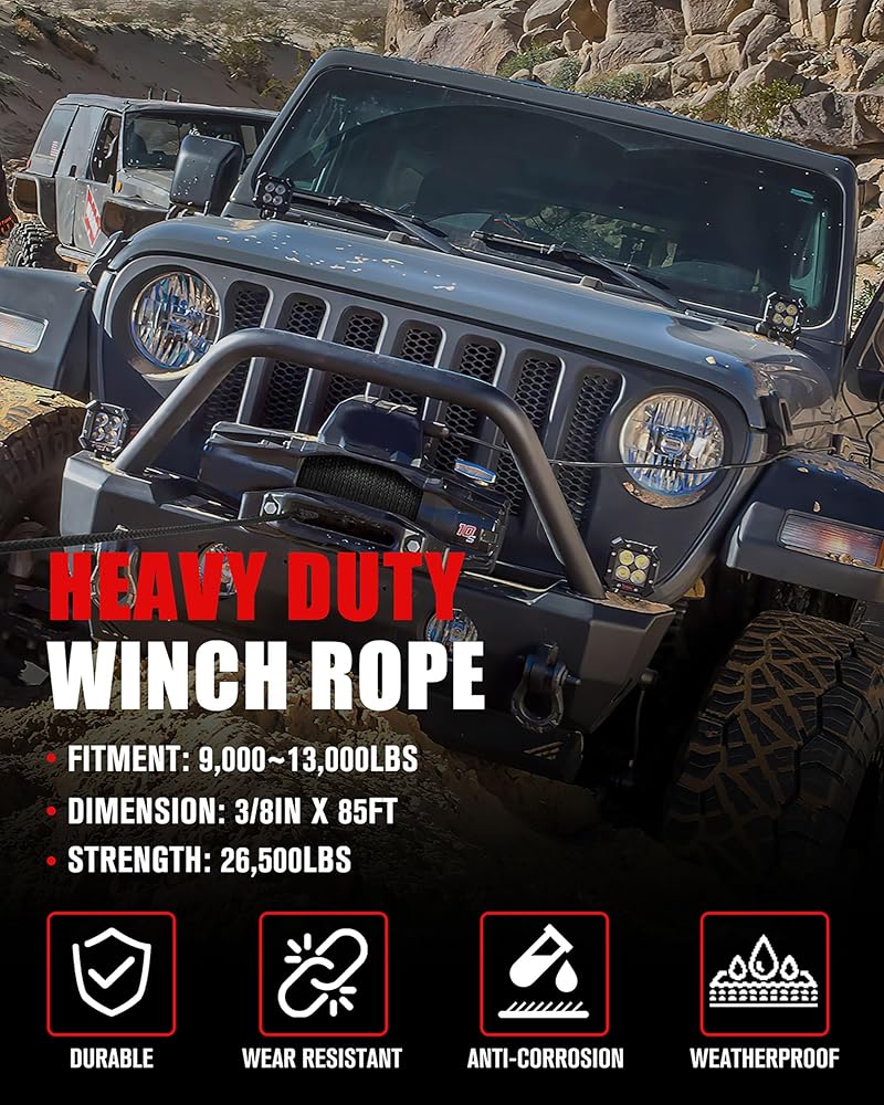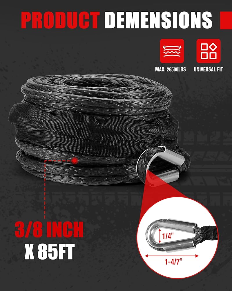 > حبل ونش صناعي بوزن 26500 رطل: مضفر بـ 12 ضفيرة من ألياف البولي إيثيلين عالية الوزن الجزيئي (UHMWPE) الاصطناعية، والتي يمكن أن توفر قوة شد تصل إلى 26500 رطل، مغطاة بطبقة من البوليستر، يزن حبل الونش الاصطناعي بطول 85FT 3/8 بوصة فقط 1/ 3 من الكابلات الفولاذية بنفس الحجم، ولن تصدأ أبدًا. كما أنها أقل تكلفة وأكثر أمانًا لأن حبل الونش الاصطناعي هذا لا يخزن أي طاقة حركية تحت الحمل