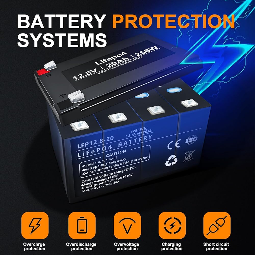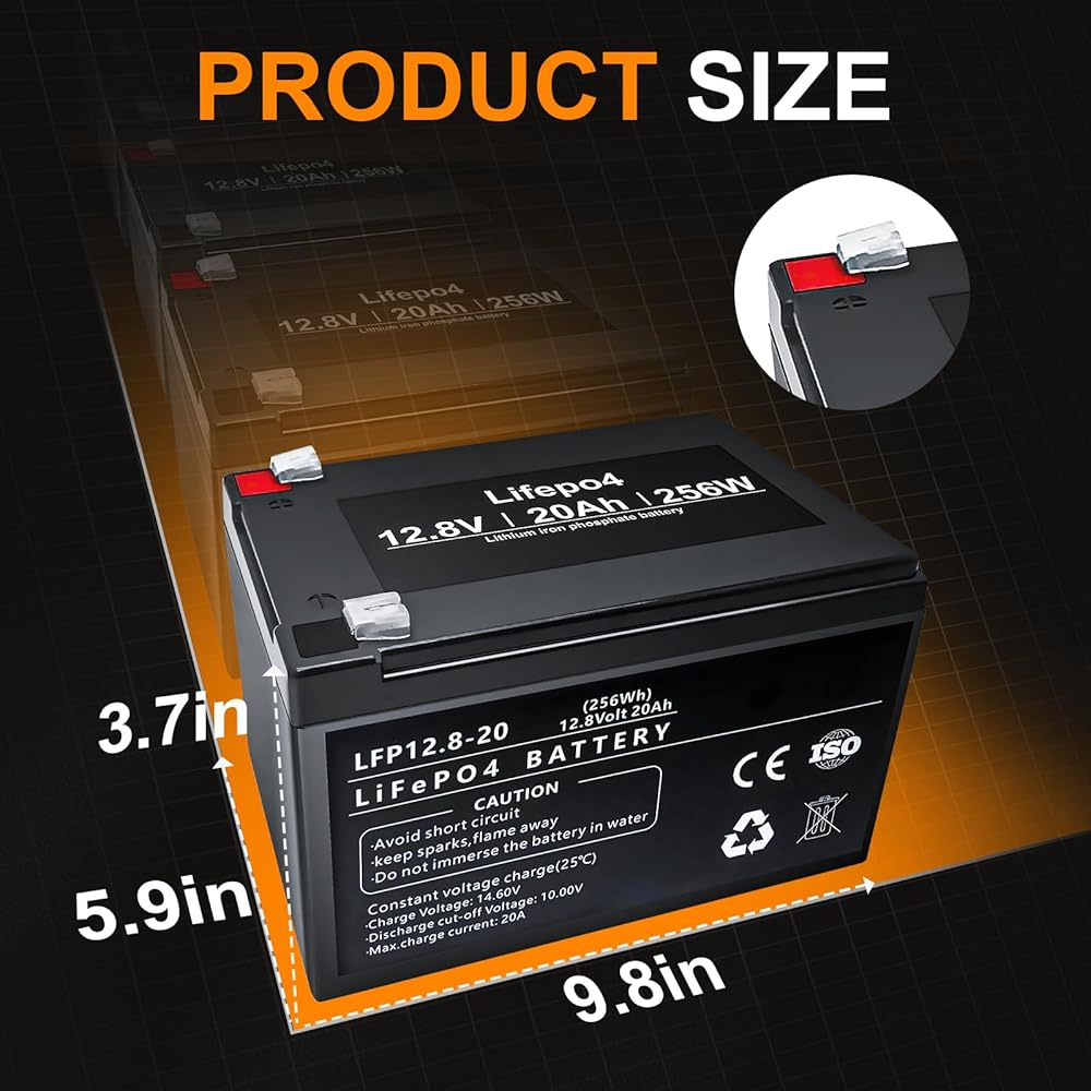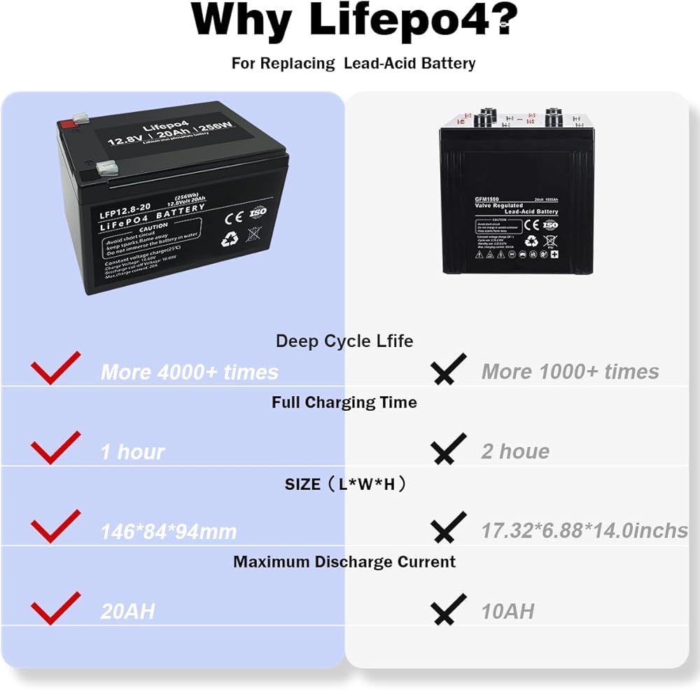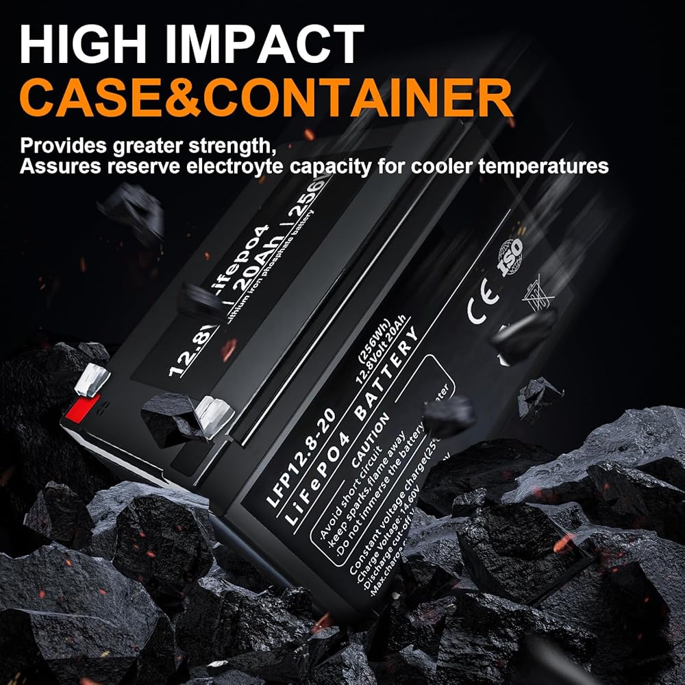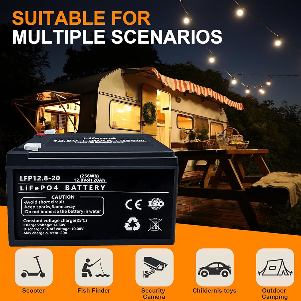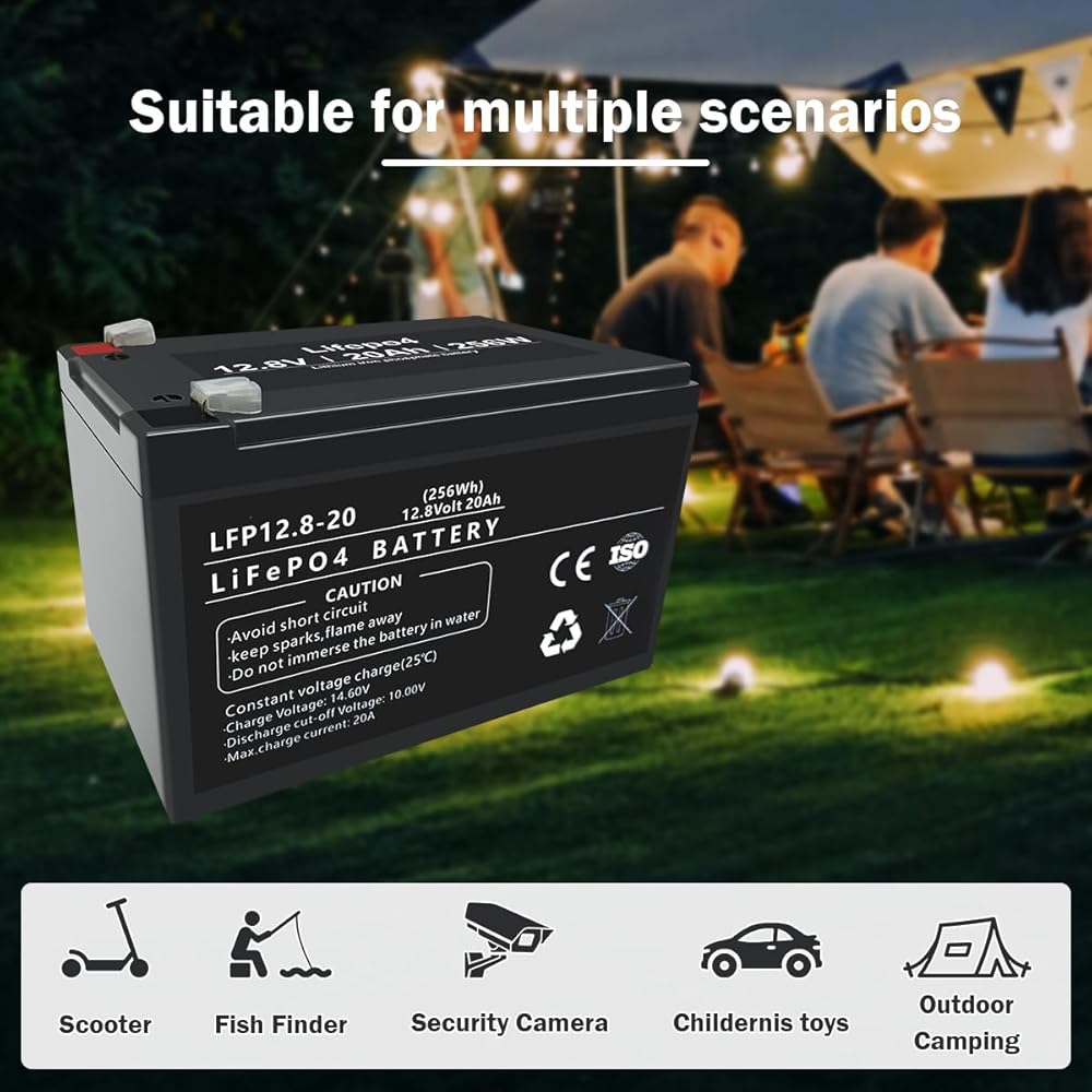 Built-in 20A BMS】Deep cycle battery has internal with 20A BMS, which can prevent battery overcharge, current short circuit, with high temperature auto disconnect function, better protect the battery.It can prevent charging over 167°F (75°C). 【Advanced technology】LiFePO4 battery manufacturing is completed by four automotive grade 3.2v20ah batteries with high energy density, stable performance and more power. High quality cycle performance, fast charge and discharge speed continuous output 20A, charging efficiency up to 100%, no matter what state the battery is in, as long as the charge can be used. Support battery expansion, up to 4 in series (12V 20AH). 【High Quality Life and Weight】12V 20AH Lithium Iron Phosphate LiFePO4 battery has long life and light weight. 12V 20AH LiFePO4 battery provides more than 5000 cycles, lead-acid batteries only 400 to 500 times, the life of LiFePO4 battery is 10 times longer than standard lead-acid batteries, and the weight of LiFePO4 battery is 50% lighter than lead-acid batteries of the same capacity, so it can be more convenient to Carry 【Safety & Environmental Protection】 Lithium iron phosphate chemical structure makes lithium iron phosphate batteries will not burn or explode even under high temperature, impact, crash and puncture. It has the highest level of safety based on the CE/ROHS test certificate of the battery inside the cell. And it does not contain any heavy metals and rare metals, more environmentally friendly, known as the green energy battery.