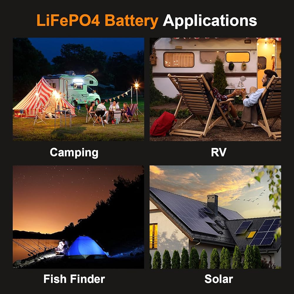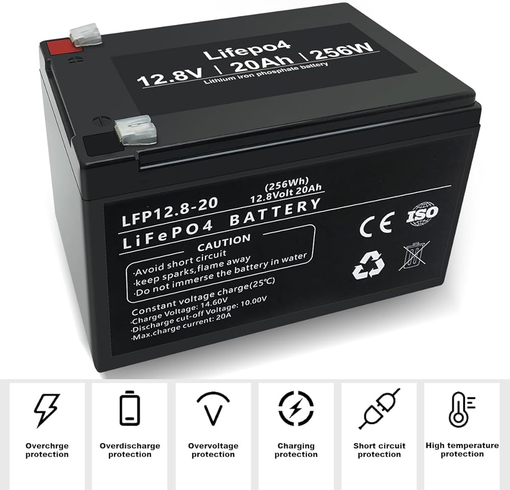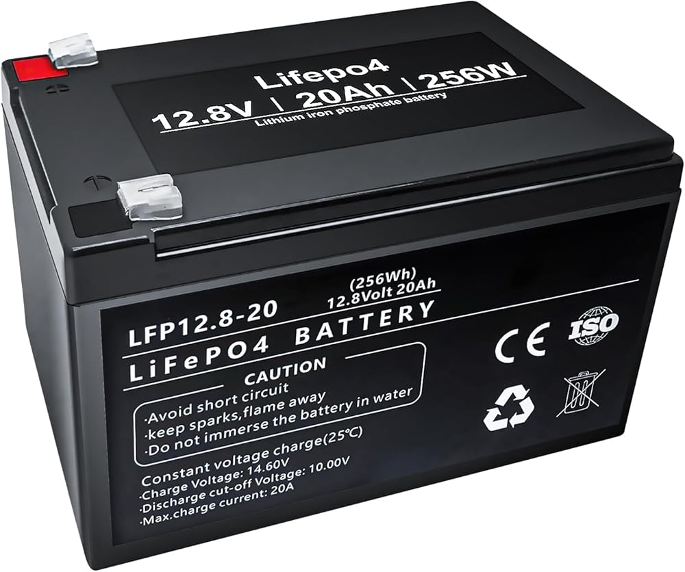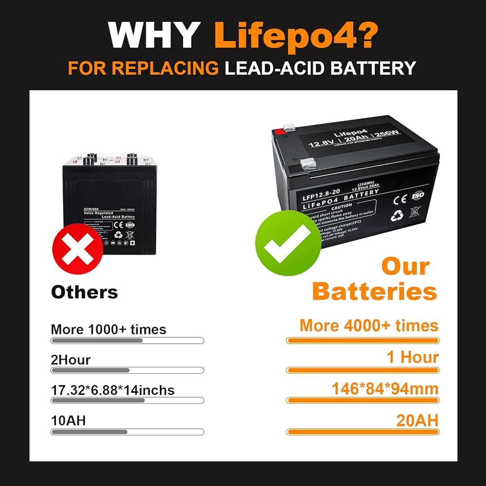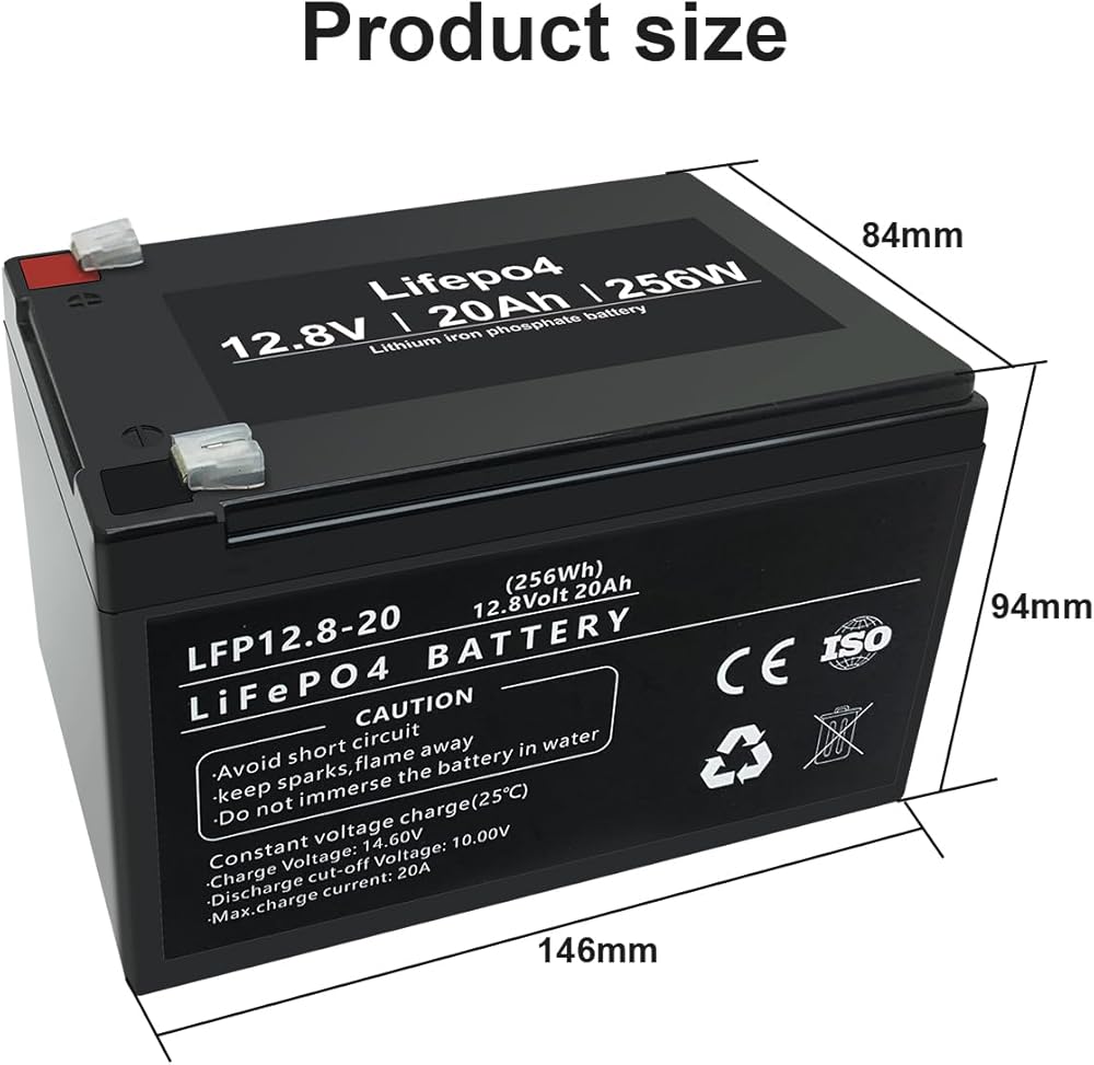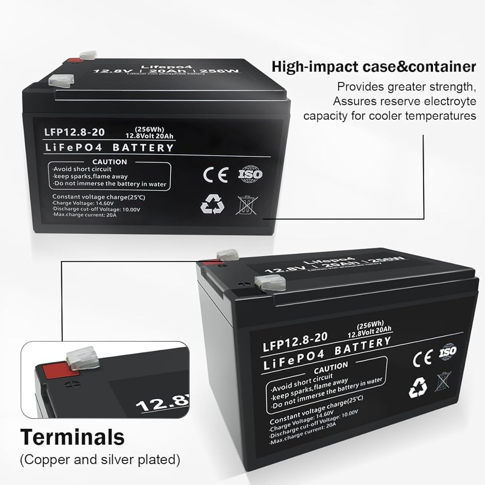Built-in 20A BMS】Deep cycle battery has internal with 20A BMS, which can prevent battery overcharge, current short circuit, with high temperature auto disconnect function, better protect the battery.It can prevent charging over 167°F (75°C). 【Advanced technology】LiFePO4 battery manufacturing is completed by four automotive grade 3.2v20ah batteries with high energy density, stable performance and more power. High quality cycle performance, fast charge and discharge speed continuous output 20A, charging efficiency up to 100%, no matter what state the battery is in, as long as the charge can be used. Support battery expansion, up to 4 in series (12V 20AH). 【High Quality Life and Weight】12V 20AH Lithium Iron Phosphate LiFePO4 battery has long life and light weight. 12V 20AH LiFePO4 battery provides more than 5000 cycles, lead-acid batteries only 400 to 500 times, the life of LiFePO4 battery is 10 times longer than standard lead-acid batteries, and the weight of LiFePO4 battery is 50% lighter than lead-acid batteries of the same capacity, so it can be more convenient to Carry 【Safety & Environmental Protection】 Lithium iron phosphate chemical structure makes lithium iron phosphate batteries will not burn or explode even under high temperature, impact, crash and puncture. It has the highest level of safety based on the CE/ROHS test certificate of the battery inside the cell. And it does not contain any heavy metals and rare metals, more environmentally friendly, known as the green energy battery.