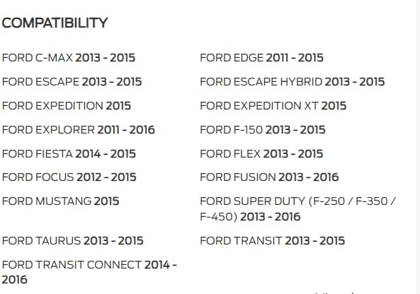 Compatible with Models: FORD SUPER DUTY (F-250 / F-350 / F-450) 2013 - 2016 Ford C-MAX 2013 - 2015 Ford Edge 2011 - 2015 Ford ESCAPE 2013 - 2015 Ford ESCAPE Hybrid 2013 - 2015 Ford Expedition 2015 Ford Explorer 2011 - 2016 Ford F-150 2013 - 2015 Ford Fiesta 2014 - 2015 Ford FLEX 2013 - 2015 Ford Focus 2012-2015 Ford Fusion 2013 - 2016 Ford Mustang 2015 Ford Taurus 2013-2015 Ford Transit 2013-2016 FORD TRANSIT CONNECT 2014 - 2016