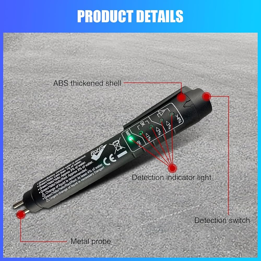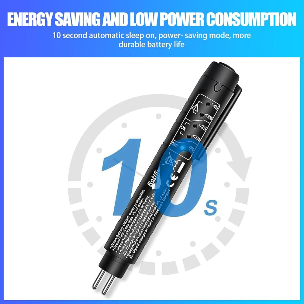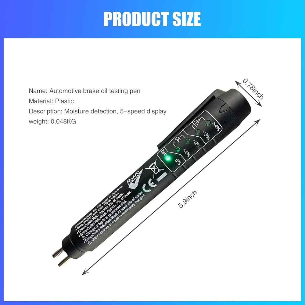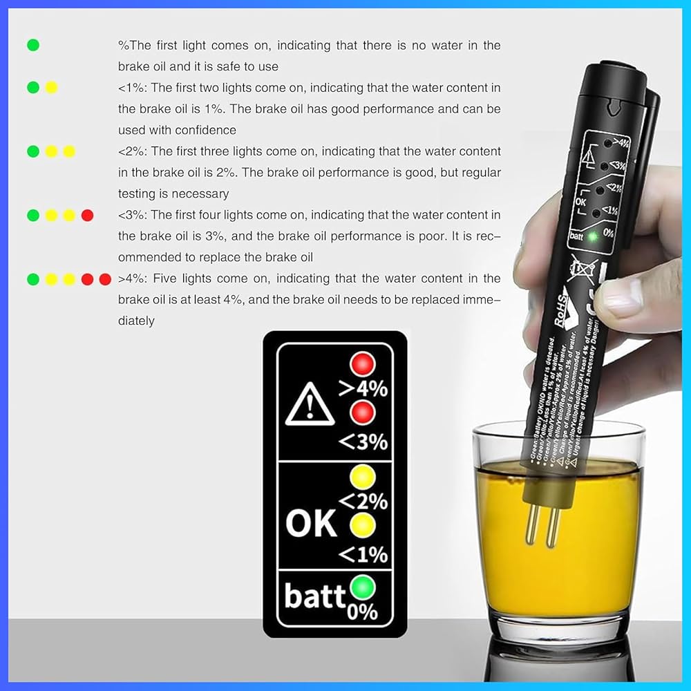 LED Light Display: There are 3 LED lights on the brake fluid quick detection pen, which are green, yellow and red. Green: The battery is OK/no water. Green/Yellow: Moisture content is less than 1%. Green/Yellow/Yellow: Moisture content close to 2%. Green/Yellow/Yellow/Red: The water content is close to 3%, it is recommended to replace the brake fluid. Green/Yellow/Yellow/Red/Red: The water content is higher than 4%, which is dangerous and the brake fluid must be replaced immediately.