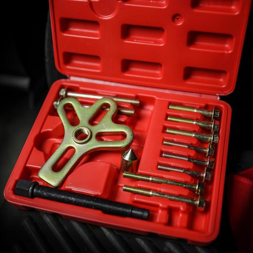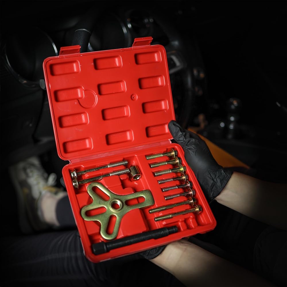 [حافظة مصبوبة بالنفخ]: أداة سحب عجلة القيادة المتوازنة المتناغمة تأتي مجموعة أدوات سحب عجلة القيادة في علبة بلاستيكية متينة مصبوبة بالنفخ لضمان تحديد وتنظيم فعال لأجزاء سحب الموازن المتناغم