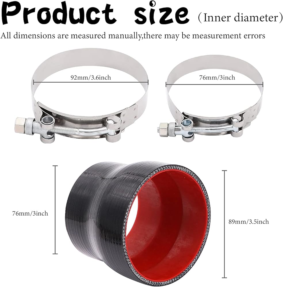 Coupler inner Diameter: 3 inch -3.5 inch (76mm-89mm).Length: 3 inch (76mm).Thickness: 5mm. 2x T-Bolt Clamps(92mm,100mm)
