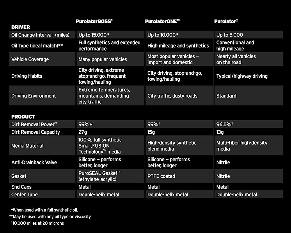 PurolatorONE is ideal for a wide range of tough driving conditions, including towing, stop and go traffic, commuting and harsh weather conditions. This filter offers advanced engine protection, especially when used with synthetic and high mileage oils.