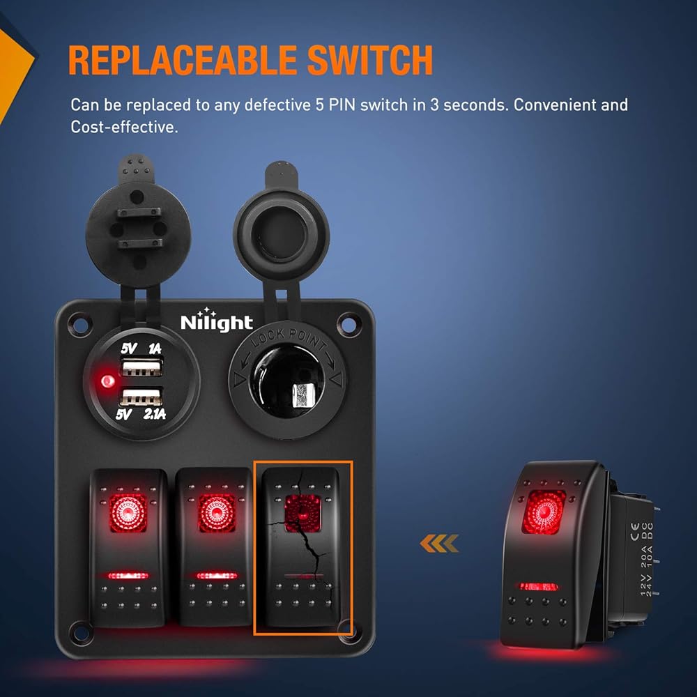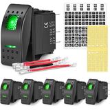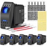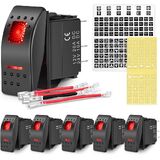 Nilight 6 Pack Rocker SwitchesSpecifications:Rated Voltage: 12V 20A DC / 24V 10A DCContact Type: SPSTPosition: ON-OFFMaterial: Superior ABS and PCTerminal Number: 5 PinsFeatures:1.5 pin on-off rocker switch with SPST design (single pole single Throw), simple installation, freely turn on or off the light2.Rated at 20amp/12VDC and 10amp/24VDC, Fits for 12V/24VDC vehicles Trucks,Yachts,Marine Boats, suitable for controlling all electronic equipment on board.PACKAGE INCLUDED6 x Rocker Switches2 x DIY Stickers5 x Jumper wires set