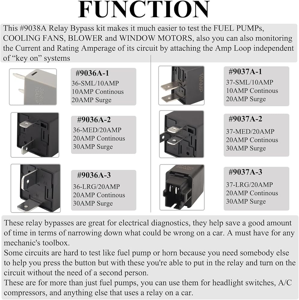 【الوظيفة】تسهل مجموعة تجاوز التتابع هذه اختبار مضخات الوقود ومراوح التبريد والمنفاخ ومحركات النوافذ، كما يمكنك أيضًا مراقبة التيار وتصنيف التيار الخاص بدائرتها عن طريق ربط حلقة أمبير.