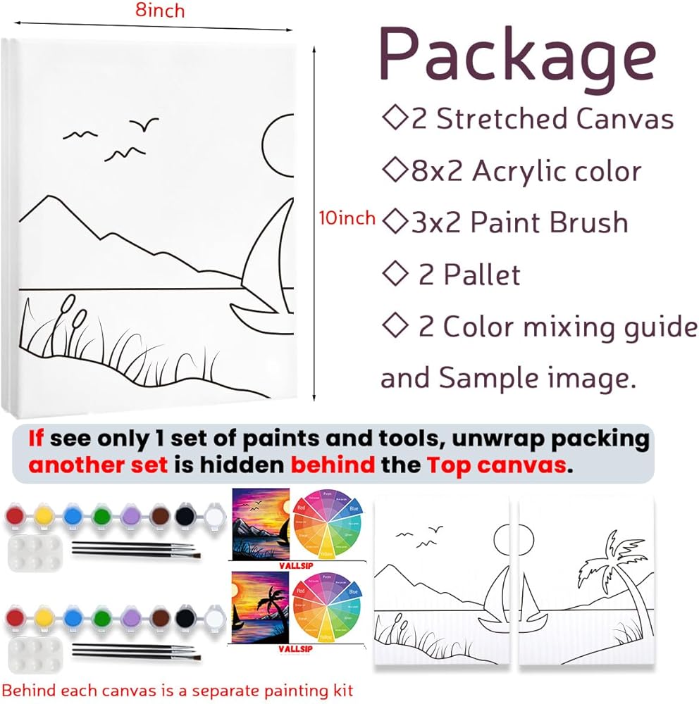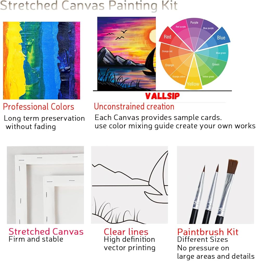محتويات العبوة مرتين: 8 × 10 قماش ممتد مرسوم مسبقًا؛ 8 ألوان أكريليك، 3 فرشاة طلاء، لوحة ألوان، دليل خلط الألوان وصورة عينة. يتم وضعها خلف كل قماش على حدة.