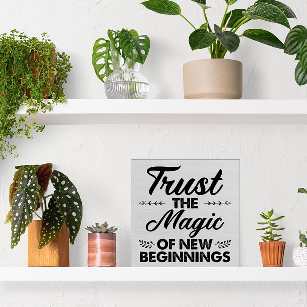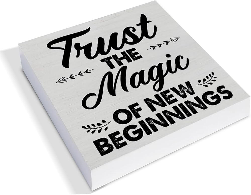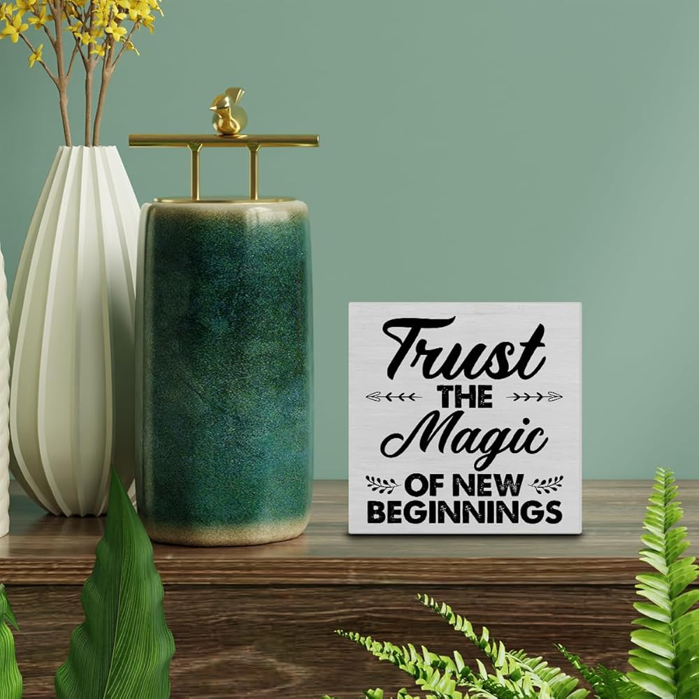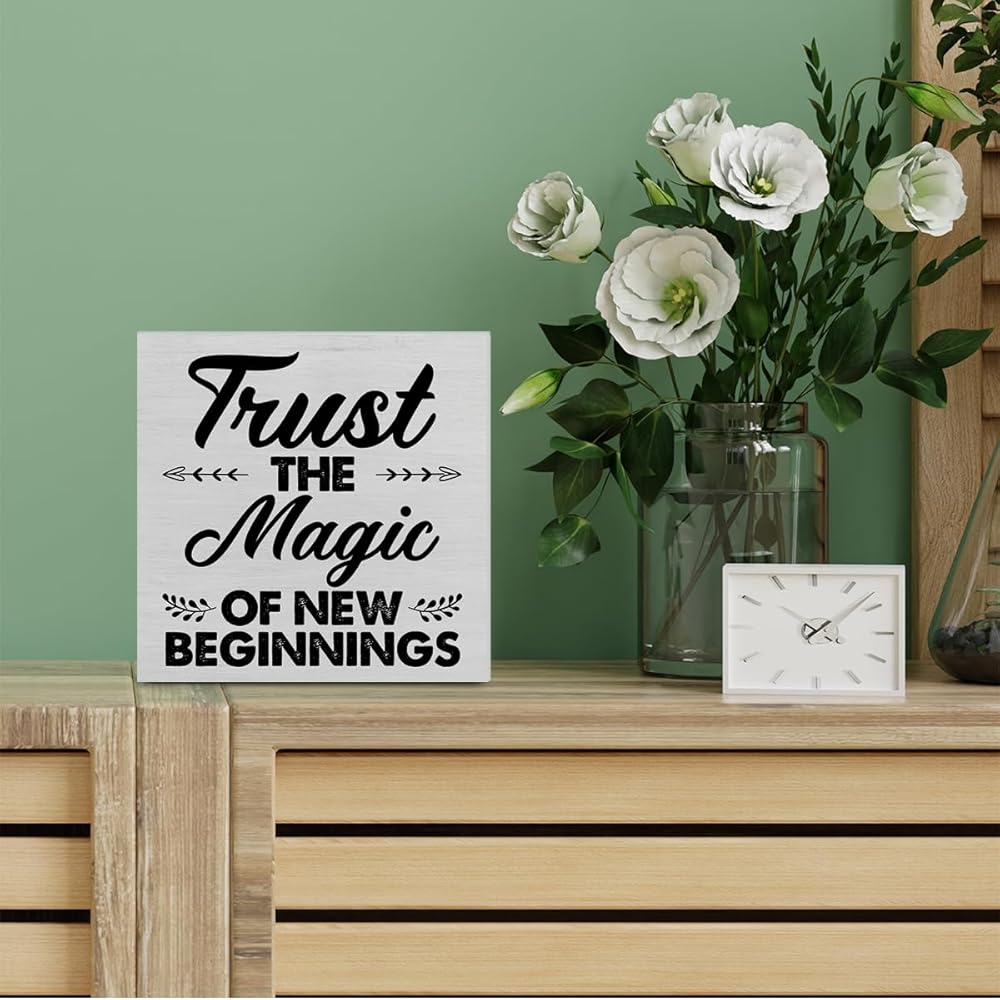 لافتة صندوق خشبي ملهمة، ثق بسحر البدايات الجديدة، لافتة خشبية للمكتب المنزلي، رف الطاولة، ديكور المكتب، 12.7 × 12.7 سم