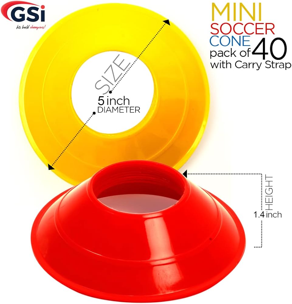 • ✔ WHAT'S IN THE BOX: As part of this order, you will receive a pack of 40 GSI Mini Saucer cones with diameter of 5 inch and a height of 1.4 inch along with a shoulder strap. The Mini Soccer cones come in 4 colors: Red, Blue, Yellow & White.