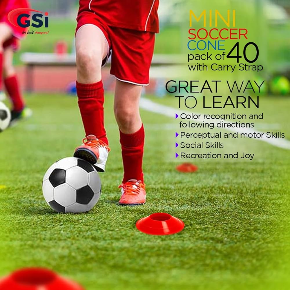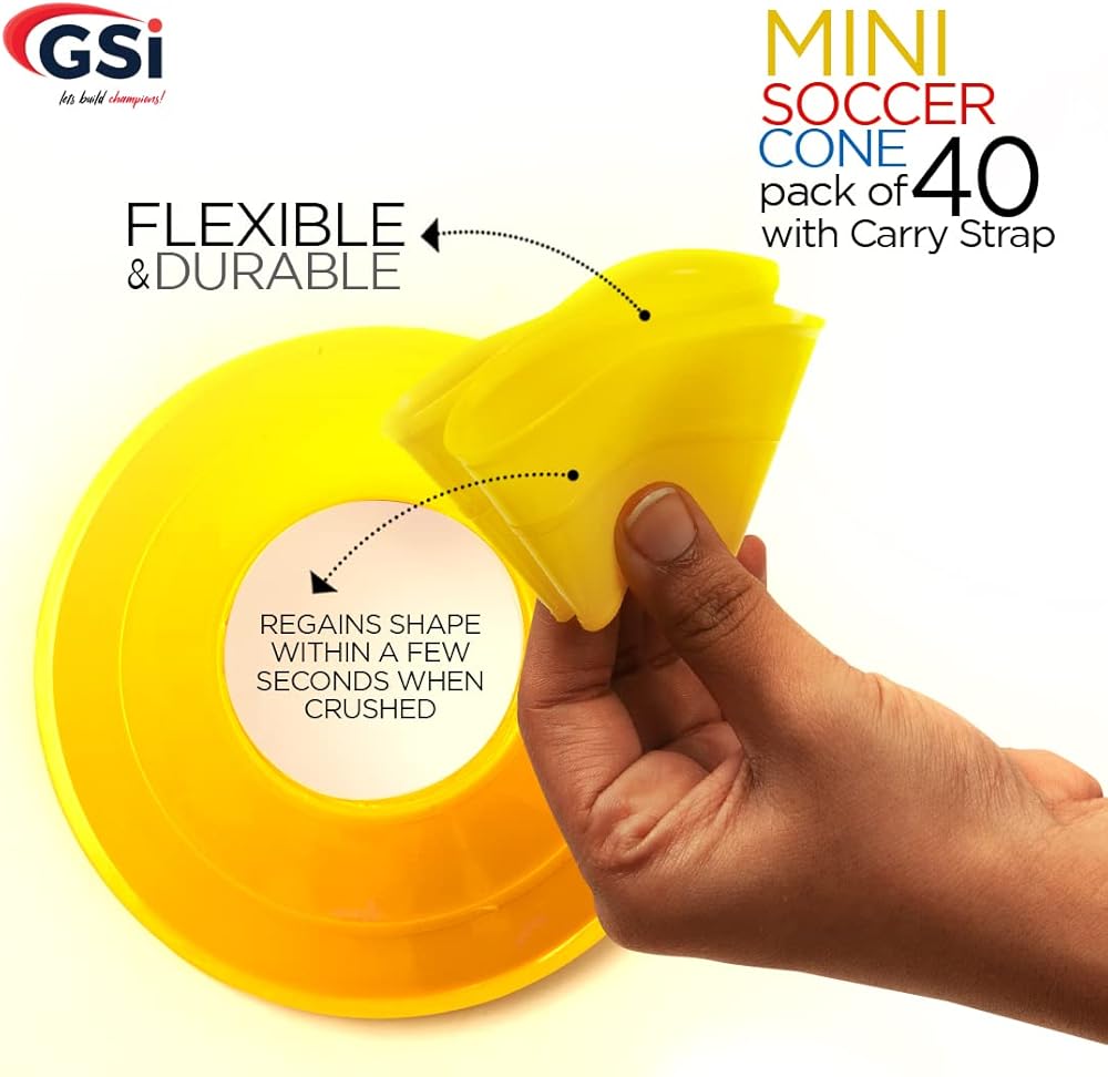 • ✔ HIGH QUALITY: GSI Mini Soccer cones are made of robust and low-density polyethylene (LDPE) thermoplastic polymer, which is soft and flexible and makes the Cones unbreakable. These cones are durable and long-lasting and bounce back after getting stepped on, kicked, and run over season after season.