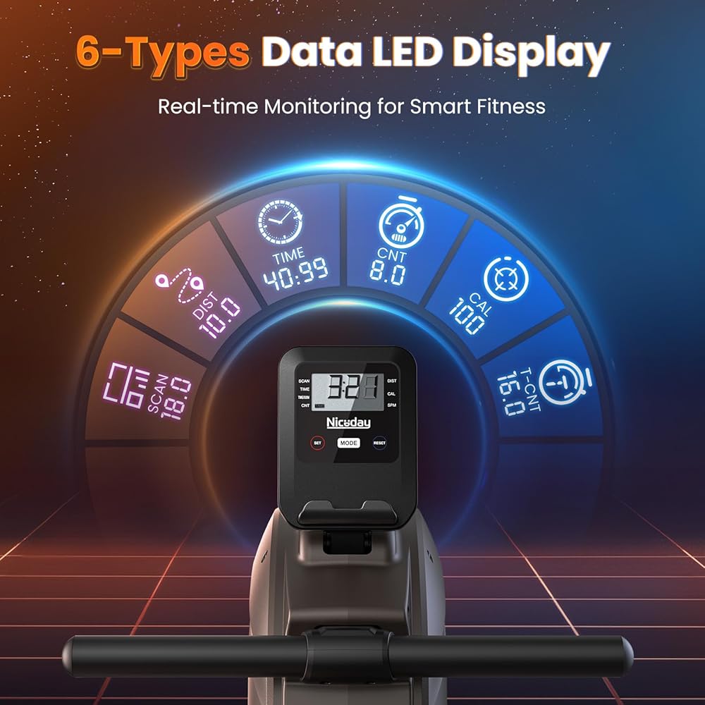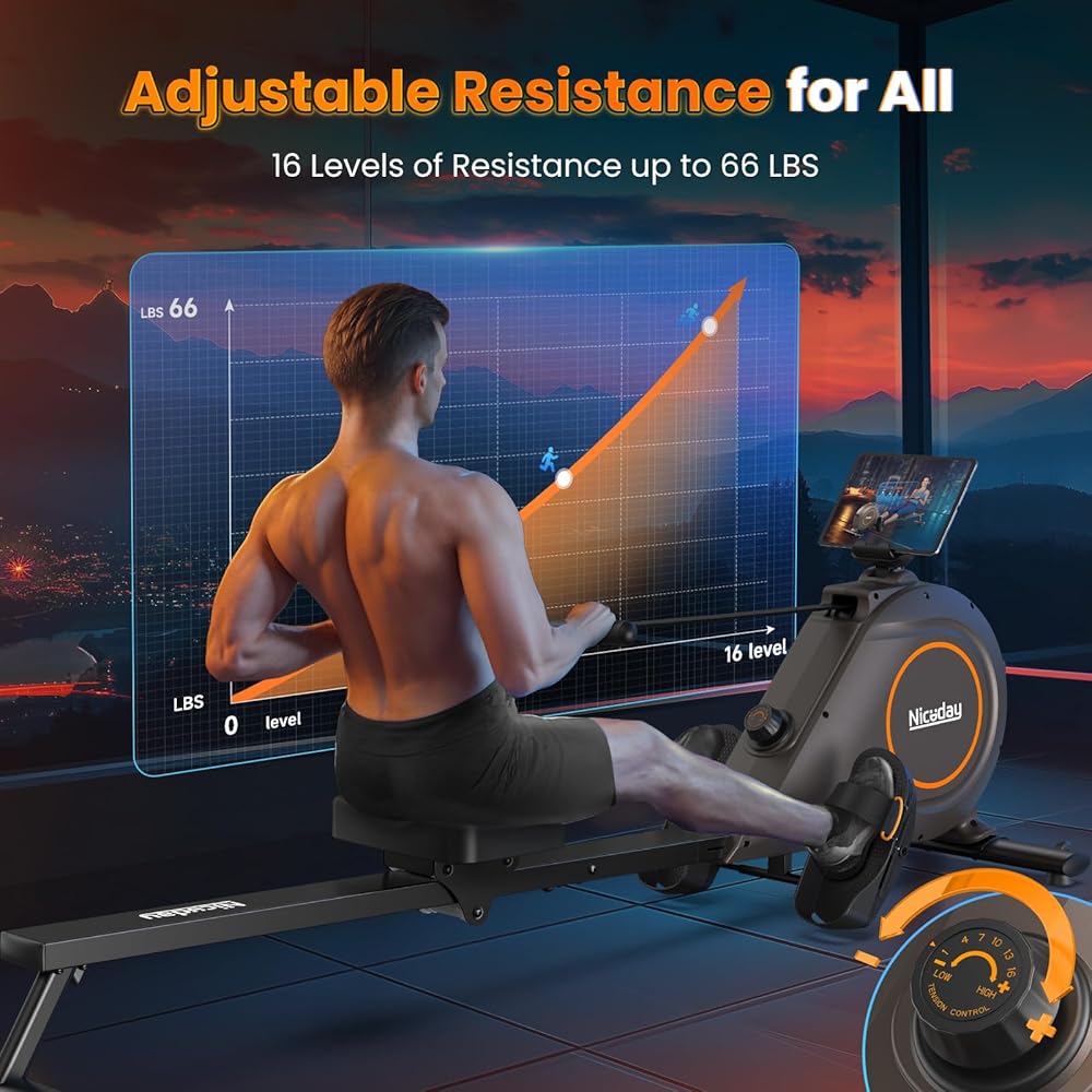【16 مستوى مقاومة ثابتة】تتميز آلة التجديف Niceday بـ 16 مستوى مقاومة ثابتة. المقاومة من 5 رطل إلى 66 رطل تشغل 90% من مجموعات العضلات، مما يحقق توازنًا بين تدريبات الأيروبيك والقوة، مما يوفر كثافة تدريب مثالية للعلاج الطبيعي وحرق الدهون وتعزيز القدرة على التحمل.