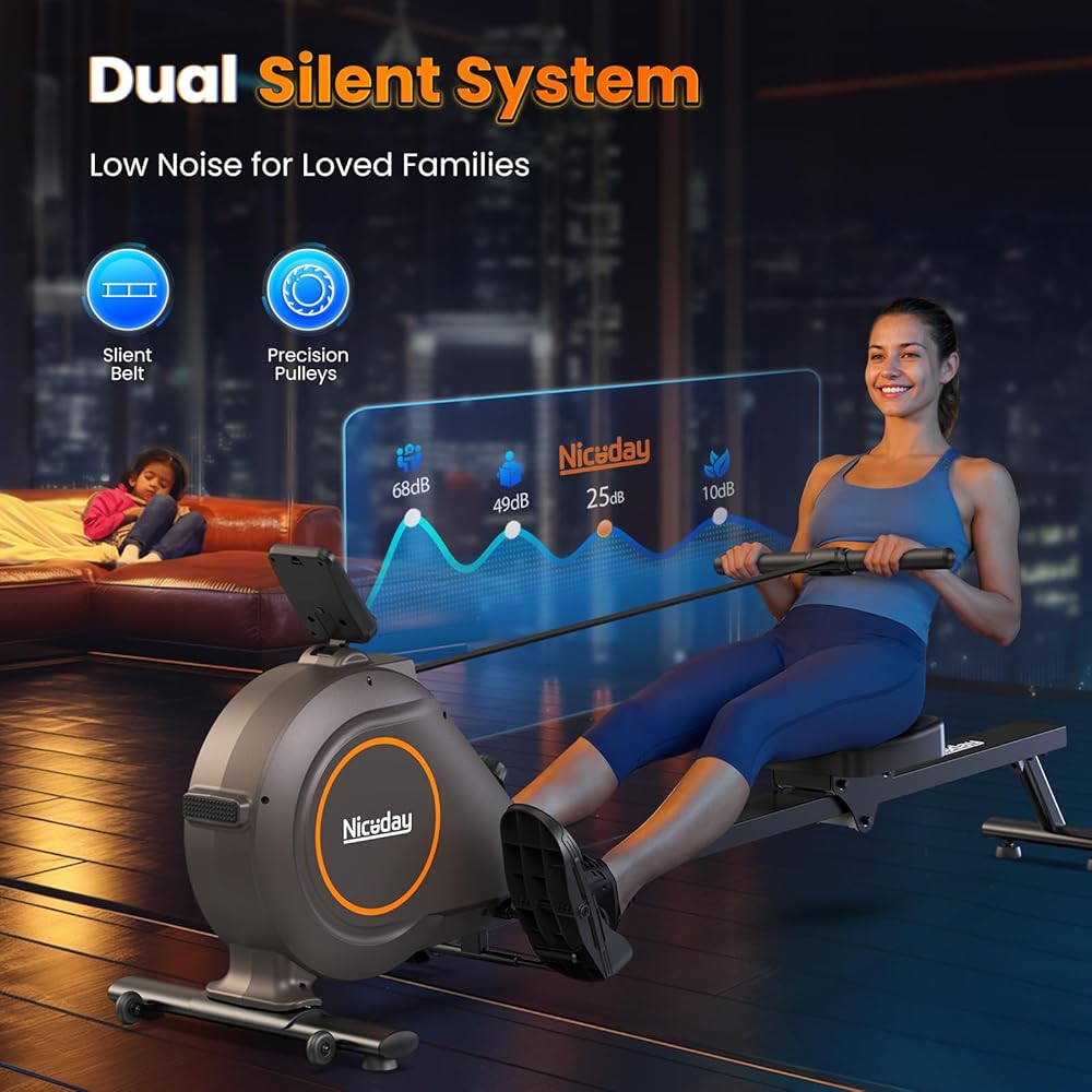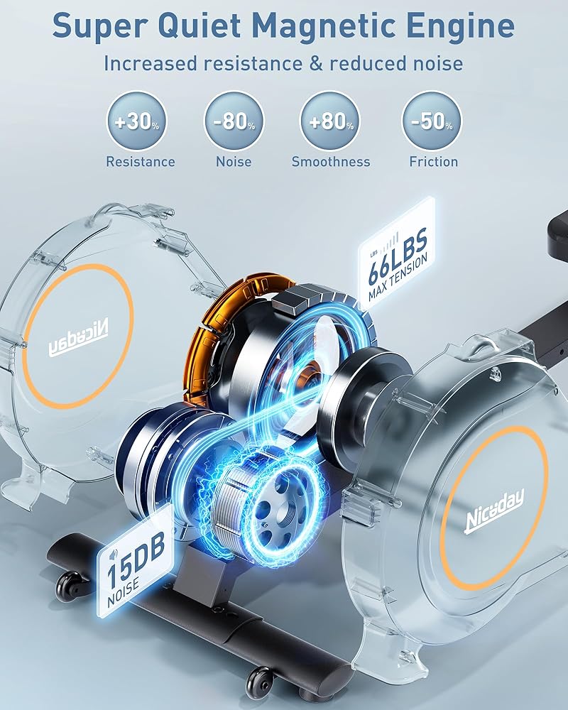 【محرك مغناطيسي هادئ للغاية】تتميز آلة التجديف Niceday بعجلة طيران بوزن 16 رطلاً ومغناطيسات عالية الطاقة، مما يزيد من الحد العلوي للمقاومة إلى 66 رطلاً، مما يوفر إمكانيات لا حدود لها للتمرين الخاص بك. تعمل التقنية الحصرية على تقليل الضوضاء بنسبة 80% إلى 15 ديسيبل - وهي أكثر هدوءًا من التنفس، مما يجعلها خيارًا لا غنى عنه لصالة الألعاب الرياضية المنزلية.