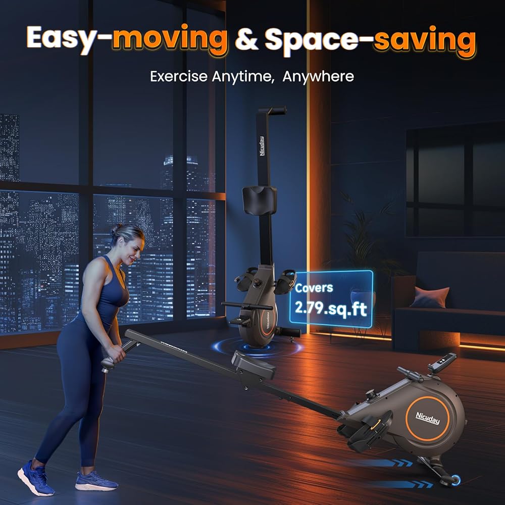 【مشهد تجريب الحرية】 لا تتطلب آلة التجديف Niceday سوى مساحة تمرين مدمجة 200*50 سم. يستغرق تصميم التخزين المستقيم 0.26 قدم مربع فقط. تعمل بدون مصدر كهربائي، وبمساعدة عجلات النقل، يمكنك نقلها بسهولة إلى أي موضع ترغب فيه. إنها تبرز كمعدات اللياقة البدنية المثالية لمساحات التمرين المحدودة.