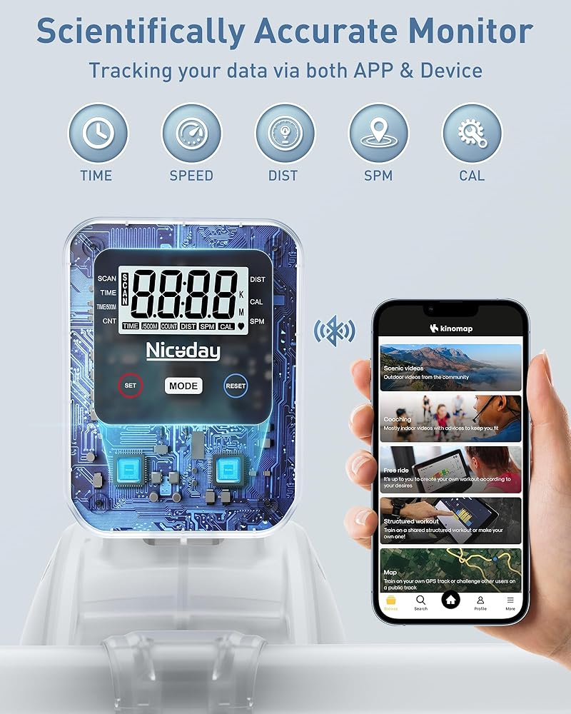 【استمتع باللياقة الذكية】تضمن شراكة Niceday مع Kinomap أن تدريباتك لن تكون مملة أبدًا. مع الآلاف من مقاطع الفيديو، تصبح التدريبات الخاصة بك جذابة إلى ما لا نهاية. تحديات التمرين الشغوفة تجعل رحلة اللياقة البدنية الخاصة بك أقل عزلة. تسجل الشاشة الرقمية بدقة كل إنجاز، بما في ذلك الوقت والعدد والسرعة والمسافة والسعرات الحرارية والمسافة الإجمالية.
