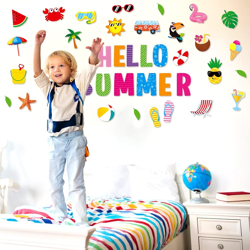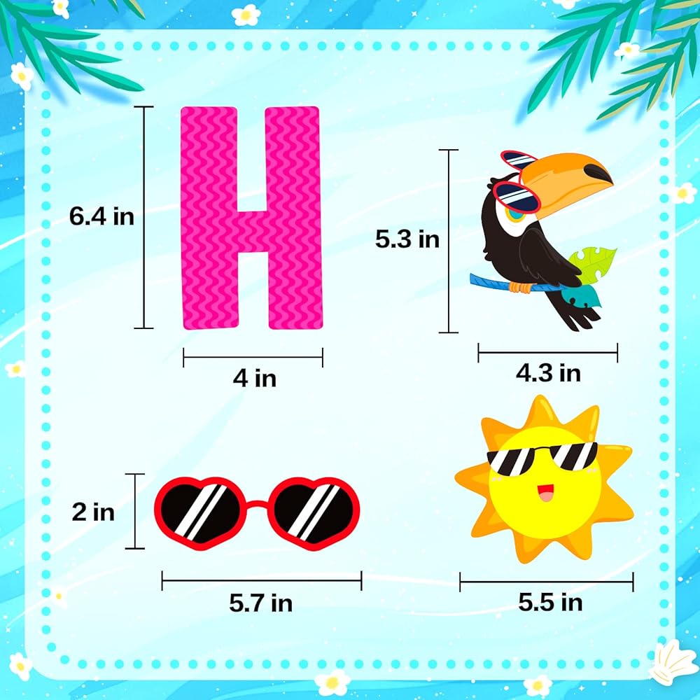 ديكور صيفي -- مصمم بكلمات هيلو سمر وعناصر الصيف الغنية، مثل الشمس والأناناس والبطيخ والأوراق الاستوائية والزهور والنظارات الشمسية وما إلى ذلك. التصميم الجميل اللطيف واللون الزاهي يجعلها مجموعة رائعة لحمام السباحة / الشاطئ الصيفي لتزيين الفصول الدراسية والغرفة والمكتب.