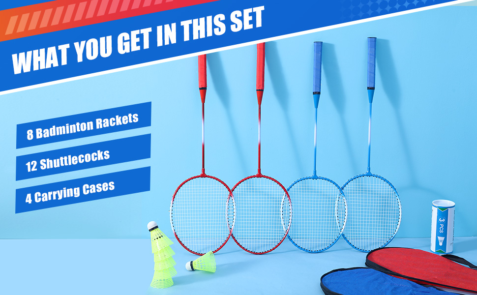مجموعة غنية وكاملة: سوف تحصل على 4 مجموعات من مجموعات مضارب كرة الريشة و12 كرة ريشة، كل زوج من الريشة يأتي مع حقيبة حمل تستخدم لمرة واحدة، وهي مريحة لك لحملها وإعادتها عند الخروج؛ ملحوظة: لا يمكن تمزيق الغشاء الموجود على المقبض، حتى لا يؤثر على تجربة المستخدم في حالة سقوط الحزام القماشي