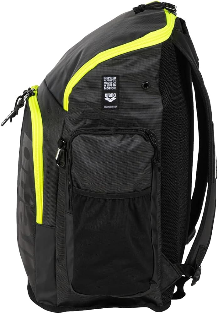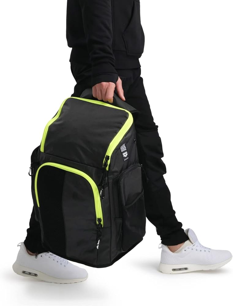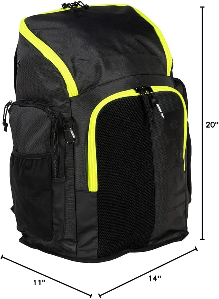 Swimmers love this ultra-smart and eye-catching backpack! Easily carry your swimwear, gear and towel in our spacious, comfortable and stylish arena Spiky III Backpack 45, specially designed for swimmers and athletes. The top loading main compartment, three additional zip pockets, mesh side pockets and a separate swim bag for wet garments ensure excellent storage space for all your training gear. The main compartment and smaller front pocket optimize organization and the two mesh side pockets keep water bottles and other essentials accessible. Equipped with water-repellent fabric to keep moisture under control and a reinforced bottom that protects stored contents from wet floors, this athletic bag is the perfect choice for swim training, competitions and other sports activities. The padded breathable back panel and ergonomic shoulder straps ensure outstanding comfort. This stylish swimming backpack measures 20 in x 11 in x 14 inches and has a capacity of 45L.